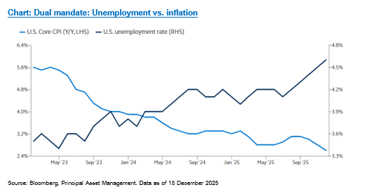 As 2025 draws to a close, the year has been characterized by economic volatility, evolving monetary policies, and shifts in global growth dynamics. We begin this month’s article with key updates from the US labor market and inflation data, as the Bureau of Labor Statistics (BLS) released its long-awaited employment report on December 16th, followed by the Consumer Price Index (CPI) report on December 18th. These are the first reports that encompass the period during which the US government was shut down. Non-farm payroll numbers rose by 64,000 in November, better than economists’ expectations of about 40,000 jobs. However, November’s jobs report, which is a combined employment reading for the past two months, also showed that an estimated 105,000 jobs were lost in October. The massive drop in October was largely a result of 162,000 federal government jobs being cut. This follows a trend seen throughout 2025 of significant reductions in the federal workforce. The unemployment rate jumped to 4.6% in November, giving investors hope that inflationary pressures may be cool enough for the US monetary policy to ease more than previously anticipated. The CPI number rose at a 2.7% annualized rate in November. Economists expected the CPI to have risen 3.1%. The core CPI, which strips out volatile food and energy prices, was also cooler than anticipated, increasing 2.6% over the 12-month period. It was expected to have risen by 3%.