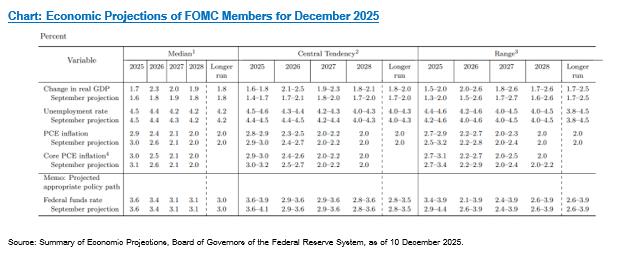 At the December meeting, The Federal Reserve (Fed) voted 9 to 3 to lower the target range for the benchmark federal funds rate by 0.25% from 3.75%-4.00% to 3.50%-3.75%. This marked the third consecutive cut, totaling a 0.75% reduction to close out the year. The 9-3 vote again featured hawkish and dovish dissents - Governor Stephen Miran favored a steeper half-point reduction while regional Presidents Jeffrey Schmid of Kansas City and Austan Goolsbee of Chicago backed a rate pause. In Fed parlance, hawks are generally more concerned about inflation and favor higher rates, while doves focus on supporting the labor market and want lower rates. In addition to the rate decision, the Fed also announced it will resume buying Treasury securities, following up on an announcement at the October meeting that it would halt its balance sheet runoff this month. The move came amid concerns about pressures in the overnight funding markets. The central bank will start by buying $40 billion in Treasury bills, beginning December 12th. The dot plot of individual officials’ expectations on rates indicated just one cut in 2026 and another in 2027 before the federal funds rate hits a longer-run target around 3%. Those projections were unchanged from the September update. On the economy, the committee raised its view of GDP growth for 2026, boosting its September projection up by half a percentage point, to 2.3%. The committee continued to expect inflation to hold above its 2% target until 2028. In a post-meeting news conference, Fed Chair Jerome Powell said additional rate cuts will be tougher to justify, and the Fed can step back and see how hiring and inflation develop.