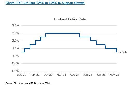 The Bank of Thailand (BOT) reduced its policy rate by 0.25% to 1.25%. The decision to lower the interest rate by 0.25% was unanimous this time, with the policy rate now at its lowest level in three years. The committee highlighted that the Thai economy is currently expanding below its potential, with vulnerabilities from both domestic structural issues and external factors exacerbating the situation. Particularly in the latter half of the previous year, economic conditions worsened more than anticipated due to several temporary factors, weakening growth prospects for the coming years. Economic pressures in the second half of the year stemmed from specific events, including factory closures and disruptions in the beverage production sector, which directly impacted manufacturing. Additionally, severe flooding in southern Thailand caused widespread damage to both lives and properties. The impact of the floods is expected to last into the first quarter of the 2026, with economic activities in affected areas continuing to be hampered, further slowing down the overall economy. The Monetary Policy Committee (MPC) revised its 2026 GDP growth forecast down to 1.5% from 1.6%.