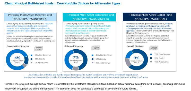 In 2026, we recommend multi-asset funds as the core holding of investors’ portfolios. Principal Multi Asset Balanced Fund (PRINCIPAL MABALANCED) provides a balanced allocation between equities and fixed income, helping manage volatility while targeting steady returns. Principal Multi Asset Income Fund (PRINCIPAL MAINCOME), with a higher allocation to fixed income, is more suitable for conservative investors, who prefer to have just some level of volatility and downside risk associated with exposure to growth assets; whereas Principal Multi Asset Global Fund (PRINCIPAL MAGLOBAL), with greater exposure to growth-oriented assets, is designed for the more aggressive investors, who can tolerate more volatility and downside risk, with higher growth exposure to the portfolio.