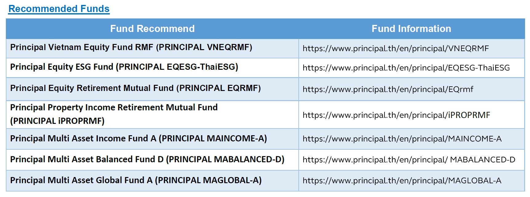 Disclaimer: Investors should understand product characteristics (mutual funds), conditions of return and risk before making an investment decision./Investing in Investment Units is not a deposit and there is a risk of investment, Investors may receive more or less return investment than the initial investment. Therefore, investors should invest in this fund when seeing that investing in this fund suitable for investment objectives of investors and investors accept the risk that may arise from the investment./ PRINCIPAL MAGLOBAL has highly concentrated investment in US. Therefore, investors should consider the overall diversification of their investment portfolio. / Investors may lose or receive foreign exchange gains or receive a lower return than the initial investment. / The fund and/or the master fund may invest in derivatives for hedging purpose depends on Fund Manager decision, investors may receive gains or losses from the foreign exchange or may receive the money less than the initial investment. / Past performance does not guarantee future results./ PRINCIPAL VNEQRMF has highly concentrated investment in Vietnam. So, investors have to diversify investment for their portfolios./ PRINCIPAL iPROPRMF mainly focuses on investment units of property fund and/or real estate investment trust (REITs) and/or infrastructure fund that the fund is exposed to the same risk as investing in real estate or infrastructure directly such as the risk of fluctuations in rental rates and lease rates, Increase in property taxes, changes in relevant laws or regulations, risk from natural disasters, building depreciation over time and the increase in interest rates, etc., as well as the risk of concentration may cause more volatility than investments distributed in many industries / PRINCIPAL iPROPRMF is concentrated in the property sector. Therefore, if there are negative factors that affect the investment, investors may lose a lot of money /PRINCIPAL Iproprmf, PRINCIPAL VNEQRMF, PRINCIPAL EQESG-ThaiESG, PRINCIPAL EQRMF investor should also study information about tax benefits as specified in the investment guideline. If not complying with investment conditions investors will not receive tax benefits and must return tax benefits.