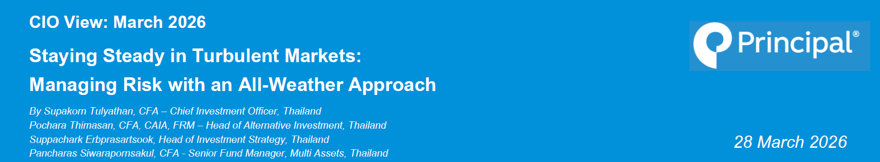 This CIO View approaches the ongoing Middle East conflict strictly through the lens of investment risk management rather than geopolitics. As a CIO, my role is not to interpret political developments or forecast how the conflict may evolve, but to help investors navigate uncertainty with a disciplined, all weather approach. The scenarios presented in this paper are not geopolitical predictions. They are analytical tools designed to frame potential macro and market implications across different paths of disruption, enabling investors to assess risks methodically rather than speculate on outcomes. This is not a trading call or a political view. For formal geopolitical analysis, readers should refer to insights published by Principal Asset Management’s Global Insights team, led by Seema Shah, Chief Global Strategist. With this risk management foundation in place, we now turn to the market dynamics shaping the months ahead.