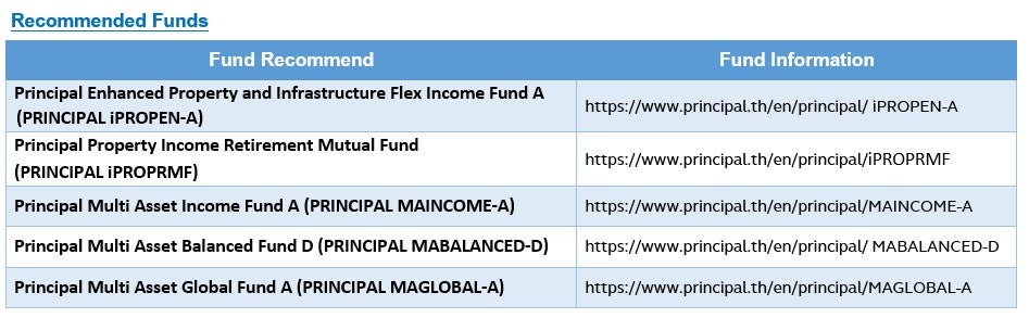 Disclaimer: Investors should understand product characteristics (mutual funds), conditions of return and risk before making an investment decision./Investing in Investment Units is not a deposit and there is a risk of investment, Investors may receive more or less return investment than the initial investment. Therefore, investors should invest in this fund when seeing that investing in this fund suitable for investment objectives of investors and investors accept the risk that may arise from the investment./ PRINCIPAL MAGLOBAL has highly concentrated investment in US. Therefore, investors should consider the overall diversification of their investment portfolio. / Investors may lose or receive foreign exchange gains or receive a lower return than the initial investment. / The fund and/or the master fund may invest in derivatives for hedging purpose depends on Fund Manager decision, investors may receive gains or losses from the foreign exchange or may receive the money less than the initial investment. / Past performance does not guarantee future results./ PRINCIPAL iPROPEN and PRINCIPAL iPROPRMF mainly focuses on investment units of property fund and/or real estate investment trust (REITs) and/or infrastructure fund that the fund is exposed to the same risk as investing in real estate or infrastructure directly such as the risk of fluctuations in rental rates and lease rates, Increase in property taxes, changes in relevant laws or regulations, risk from natural disasters, building depreciation over time and the increase in interest rates, etc., as well as the risk of concentration may cause more volatility than investments distributed in many industries / PRINCIPAL iPROPEN has highly concentrated investment in Asian countries. So, investors have to diversify investment for their portfolios / PRINCIPAL iPROPRMF is concentrated in the property sector. Therefore, if there are negative factors that affect the investment, investors may lose a lot of money. PRINCIPAL iPROPRMF investor should also study information about tax benefits as specified in the investment guideline. If not complying with investment conditions investors will not receive tax benefits and must return tax benefits.