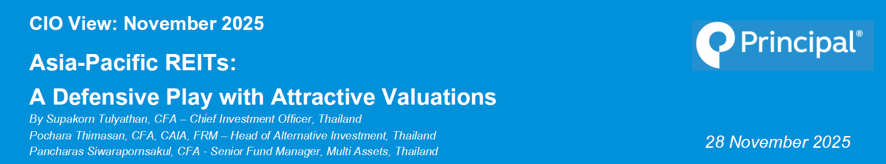PRINCIPAL iPROPEN offers investors an effective way to capture the long-term growth potential of Asian listed REITs while enjoying diversification and steady income, supported by an expected dividend yield of 4–6%. The fund provides access to high-quality REITs and real-estate securities across major Asia Pacific markets including Australia, Japan, Singapore, Hong Kong, and Thailand, benefiting from structural themes such as urbanization, logistics expansion, data-centre demand, and stable rental cash flows. Meanwhile, PRINCIPAL iPROPRMF is designed for long-term savers seeking tax-efficient retirement accumulation through the RMF structure, with exposure to Thailand and Singapore REITs delivering an expected dividend yield of 5–7%. Our portfolio strategy continues to emphasize bottom-up stock selection and strong company fundamentals to generate excess returns. With a preference for quality and strategic overweights in resilient long-term earnings growers, we expect the portfolio to be well-positioned for periods of economic weakness and lower yields. If markets revert to a risk-on environment, some relative performance headwinds may emerge, but the funds remain anchored by solid fundamentals and durable income characteristics.