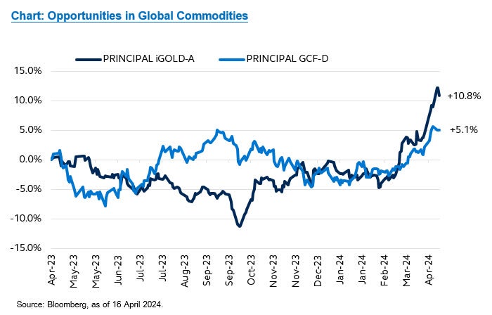 ความตึงเครียดทางภูมิรัฐศาสตร์ที่ทวีความรุนแรงเพิ่มขึ้นแสดงให้เห็นถึงความจำเป็นในการมีสินค้าโภคภัณฑ์โดยเฉพาะน้ำมันดิบในพอร์ตฟอลิโอ แม้ว่าดัชนี S&P GSCI Commodity Index จะมีผลการดำเนินงานที่ไม่โดดเด่นนักในรอบปีที่ผ่านมา แต่เรามองว่ามีแนวโน้มปรับตัวเพิ่มขึ้นได้ เนื่องจากสถานการณ์ภูมิรัฐศาสตร์ที่มีความเสี่ยงเพิ่มมากขึ้น เพื่อป้องกันความเสี่ยงนี้ เราจึงแนะนำให้เพิ่มสัดส่วนการลงทุนในกองทุนเปิดพรินซิเพิล โกลบอล คอมมอดิตี้ (PRINCIPAL GCF)