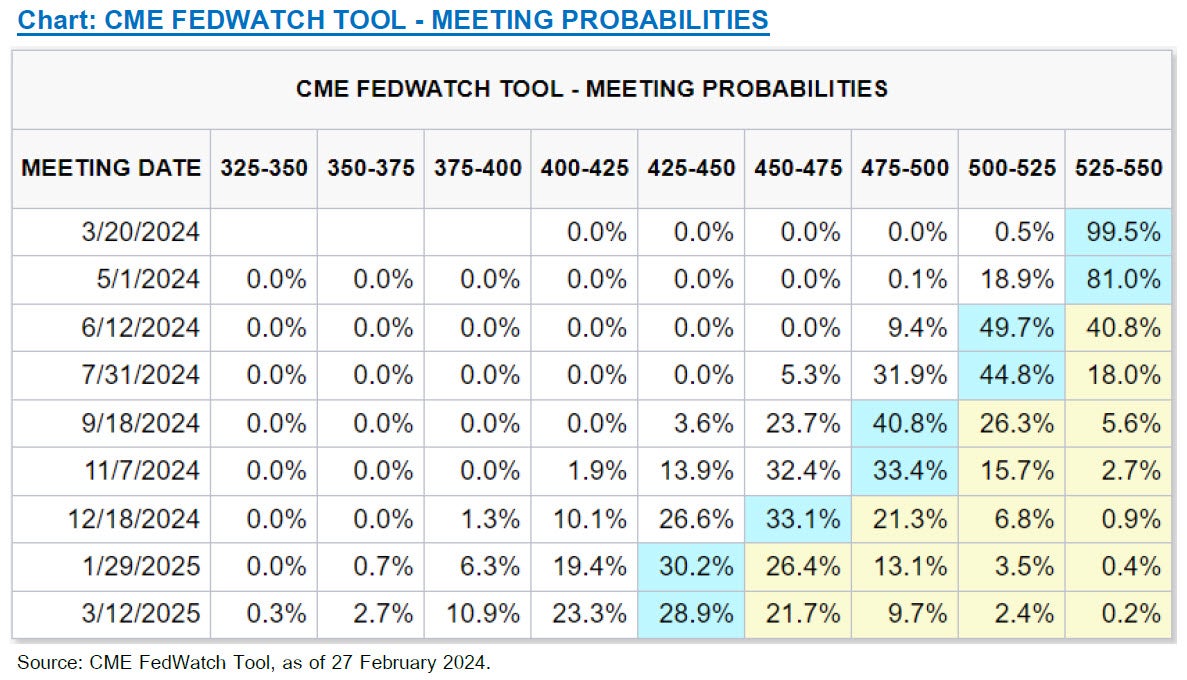 ด้านมุมมองอัตราดอกเบี้ยในปัจจุบันนักลงทุนและผู้เล่นส่วนใหญ่ในตลาดการเงินคาดว่าธนาคารกลางในกลุ่มประเทศพัฒนาแล้ว (DM) จะยังไม่ปรับลดอัตราดอกเบี้ยนโยบายในระยะเวลาอันสั้นเนื่องจากอัตราเงินเฟ้อยังคงอยู่ในระดับสูง เศรษฐกิจที่ยังเติบโตอย่างแข็งแกร่ง และการส่งสัญญาณจากธนาคารกลางประเทศต่างๆ ที่บ่งบอกถึงความระมัดระวังในการดำเนินนโยบายการเงิน อย่างไรก็ตามผู้เชี่ยวชาญส่วนใหญ่กลับมีมุมมองว่าจะมีการปรับลดอัตราดอกเบี้ยนโยบายในปีนี้ โดยคาดว่าจะเป็นเดือนมิถุนายน ทั้งนี้ช่วงเวลาในการลดดอกเบี้ยอาจแตกต่างกันเล็กน้อยในแต่ละประเทศของกลุ่มประเทศพัฒนาแล้วขึ้นอยู่กับสถานการณ์เงินเฟ้อของประเทศนั้นๆ