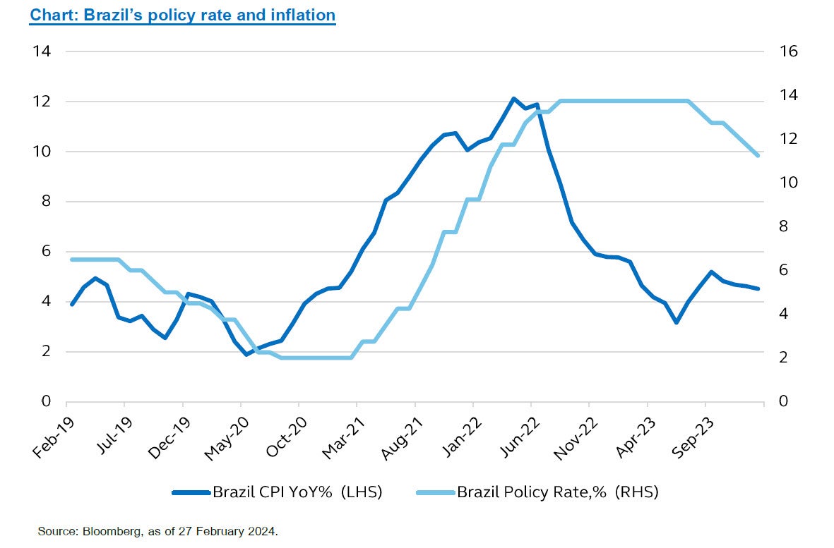 ทั้งนี้ภาพรวมการลงทุนในปัจจุบันยังคงสนับสนุนการลงทุนในกลุ่มประเทศ Emerging Market ex China จากแนวโน้มการเติบโตทางเศรษฐกิจที่ยังคงแข็งแกร่ง ในขณะที่ตัวเลขอัตราเงินเฟ้อก็ลดความร้อนแรงลง สะท้อนให้เห็นความเป็นไปได้ที่การปรับลดอัตราดอกเบี้ยนโยบายในกลุ่มประเทศกำลังพัฒนาจะดำเนินต่อไป นอกจากนี้ตัวเลขเศรษฐกิจทั่วโลกในภาพรวมก็ยังสะท้อนให้เห็นว่าอัตราเงินเฟ้อที่ปรับตัวลดลงทั่วโลกไม่ได้ทำให้เกิดการชะลอตัวของเศรษฐกิจอย่างมีนัยสำคัญ ซึ่งจะเป็นปัจจัยที่สนับสนุนให้ธนาคารกลางของกลุ่มประเทศพัฒนาแล้ว (Developed Market) เริ่มพิจารณาปรับลดอัตราดอกเบี้ยนโยบายในช่วงกลางปีนี้เช่นกัน ทั้งนี้เมื่อพิจารณาการลงทุนตามภูมิภาค เรายังคงเลือกกระจายการลงทุนบางส่วนไปยังกลุ่มประเทศละตินอเมริกา (Portfolio’s satellite idea) ในขณะที่เพิ่มความระมัดระวังในการลงทุนระยะยาวในหุ้นจีนและหุ้นเอเชีย อย่างไรก็ดีการลงทุนในหุ้นกลุ่ม EM ex-China จะช่วยลดความกังวลในส่วนนี้ลงได้