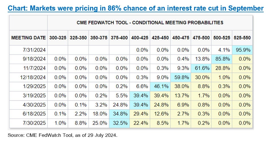 ในช่วงที่รายงาน CIO View ฉบับนี้ถูกเผยแพร่ จะเป็นช่วงที่ตลาดทั้งหมดพุ่งความสนใจไปยังการประชุม FOMC ที่จะเกิดขึ้นในระหว่างวันที่ 30 ถึง 31 กรกฎาคม ถึงแม้ว่าเราไม่ได้คาดหวังว่าธนาคารกลางสหรัฐฯ (Federal Reserve: Fed) จะเริ่มลดดอกเบี้ยหลังการหารือครั้งนี้ แต่ด้วยแนวโน้มอัตราเงินเฟ้อที่ออกมาต่ำกว่าที่คาด น่าจะทำให้ประธานธนาคารกลางสหรัฐฯ ออกมาแถลงการณ์หลังการประชุมด้วยเนื้อหาในทำนองที่ว่า “ข้อมูลเศรษฐกิจล่าสุดได้เพิ่มความมั่นใจว่าอัตราเงินเฟ้อกำลังปรับตัวลงมาตามทิศทางที่ถูกต้อง” โดยหากแถลงการณ์ออกมาตามที่เราคาดก็จะทำให้โอกาสที่ธนาคารสหรัฐฯ จะปรับลดดอกเบี้ยครั้งแรกในเดือนกันยายนนั้นเพิ่มสูงขึ้นอีก จากปัจจุบันที่ตลาดมองว่าโอกาสในการปรับลงนั้นอยู่ที่ 88% อีกทั้งนักวิเคราะห์ส่วนใหญ่อาจปรับเพิ่มประมาณการณ์จำนวนครั้งการปรับลดดอกเบี้ยในปีนี้เพิ่มขึ้นเป็น 3 ครั้ง ทั้งนี้การคาดการณ์ดังกล่าวจะสนับสนุนการลงทุนในตราสารหนี้ที่มีอายุคงเหลือค่อนข้างยาว (Long-duration) ไปจนถึงสิ้นปี รวมถึงการลงทุนในตราสารกลุ่ม Investment Grade และ High Yield