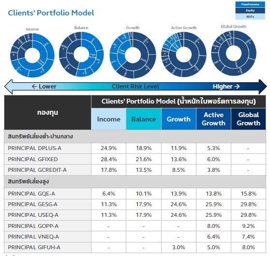คำเตือน : Principal Asset Allocation Plan เป็นบริการการแนะนำการจัดพอร์ตการลงทุนแบบการกระจายการลงทุนไปในสินทรัพย์ต่าง ๆ (Asset Allocation) ตามระดับความเสี่ยงในการลงทุนของผู้ลงทุน โดยเป็นการพิจารณาและประเมินภาวะการลงทุน เพื่อการสร้างและปรับพอร์ตอย่างสมดุล และอาจจะพิจารณาและนำเสนอการปรับเปลี่ยนสัดส่วนการลงทุนหรือปรับพอร์ตลงทุนเป็นรายเดือน เพื่อให้มั่นใจได้ว่าพอร์ตการลงทุนมีการกระจายความเสี่ยงอย่างเหมาะสมและสอดรับกับภาวะการลงทุน เนื่องจากการเปลี่ยนแปลงของราคาที่เปลี่ยนไปตามภาวะตลาดส่งผลให้สัดส่วนของแต่ละสินทรัพย์ที่ลงทุนมีการปรับเปลี่ยนไปจากสัดส่วนการลงทุนที่เหมาะสม อาจทำให้พอร์ตการลงทุนมีความเสี่ยงสูงหรือต่ำไปกว่าที่ควรจะเป็น เพื่อให้สัดส่วนการลงทุนเข้าสู่สัดส่วนการลงทุนที่เหมาะสม Principal Asset Allocation Plan เป็นเพียงคำแนะนำของ บริษัทจัดการ ผู้ลงทุนอาจ ไม่ได้รับผลตอบแทนตามคาดหวัง ทั้งนี้ ผู้ลงทุนควรทำความ เข้าใจการจัดสรรการลงทุน (Basic Asset Allocation) ตามคำแนะนำของสำนักงาน ก.ล.ต.