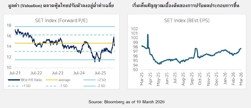 หุ้นไทยปรับตัวลงมาจากจุดสูงสุดประมาณ 10% จากความกังวลด้านภูมิรัฐศาสตร์ พร้อมแรงขายทำกำไร หลังปรับตัวขึ้นอย่างมีนัยตั้งแต่ที่รู้ผลการเลือกตั้งในวันที่ 9 ก.พ. โดยการปรับตัวลงในครั้งนี้ส่งผลให้ตลาดหุ้นไทยมีความน่าสนใจต่อการลงทุนมากขึ้น เนื่องจากมูลค่า (Forward P/E) ลงมาอยู่ต่ำกว่าค่าเฉลี่ยย้อนหลัง 5 ปี และเริ่มเห็นสัญญาณนักวิเคราะห์ปรับประมาณการณ์ผลประกอบการบริษัทจดทะเบียนขึ้นหลังเตรียมได้รัฐบาลใหม่ รวมถึงมีแรงหนุนจากเงินลงทุนจากต่างประเทศตั้งแต่ต้นปี โดยนักลงทุนต่างชาติมีสถานะซื้อสุทธิตั้งแต่ต้นปี (YTD) ถึง 43,584 ล้านบาท (Source: set.or.th as of 9 March 2026)
