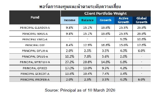 จากปัจจัยดังกล่าว บลจ.พรินซิเพิล แนะนำให้ทยอยสะสมหุ้นไทยเพิ่มเติมผ่านกองทุน PRINCIPAL DEF หรือ PRINCIPAL iDIV และปรับมุมมองหุ้นไทยสู่ Slightly Overweight จาก Neutral โดยปัจจัยที่ต้องจับตามองคือความรวดเร็วในการจัดตั้งรัฐบาล, ครม.ชุดใหม่แถลงนโยบายต่อรัฐสภาซึ่งคาดว่าจะเกิดขึ้นในช่วงปลายเดือน เม.ย. 69 และความผันผวนของราคาพลังงาน