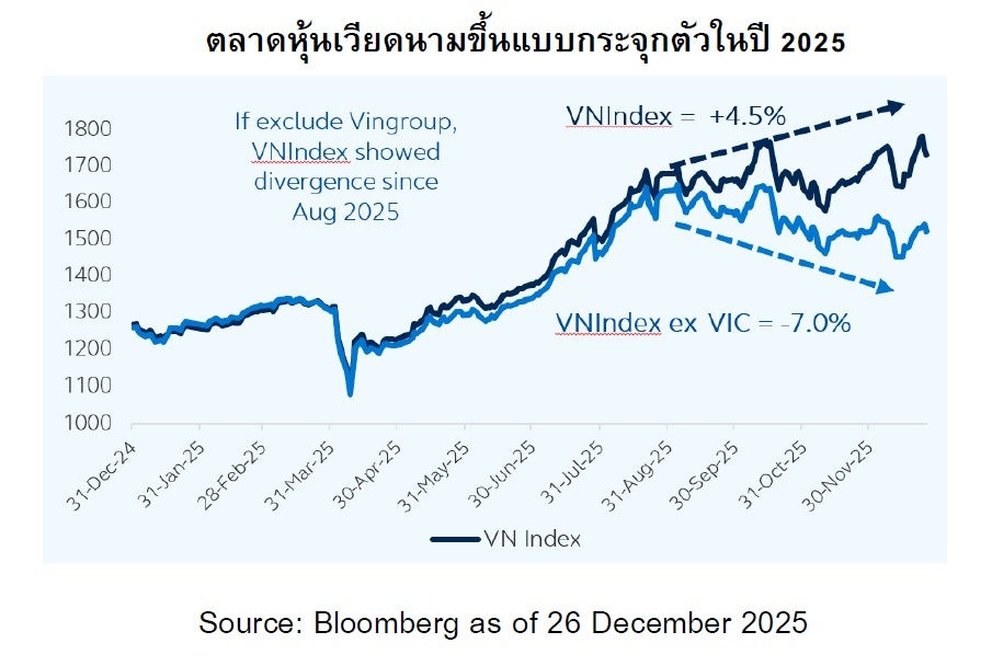 ในปี 2025 ตลาดหุ้นเวียดนามปรับตัวขึ้นได้ถึง 40.87% ถือเป็นหนึ่งในตลาดหุ้นที่ทำผลตอบแทนได้โดดเด่นที่สุดในปี 2025 แต่อย่างไรก็ตามการปรับขึ้นของตลาดหุ้นเวียดนามยังคงเป็นไปแบบกระจุกตัว โดยเฉพาะนับตั้งแต่เดือนส.ค. เป็นต้นมา VN Index ปรับตัวขึ้นราว 4.5% แต่หากหักผลจากราคาหุ้น Vingroup ออกจะพบว่าดัชนีปรับตัวลงราว 7% และหากนับตั้งแต่ต้นปี 2025 การเคลื่อนไหวของราคา Vingroup มีผลต่อ VN Index ถึงประมาณ 50%