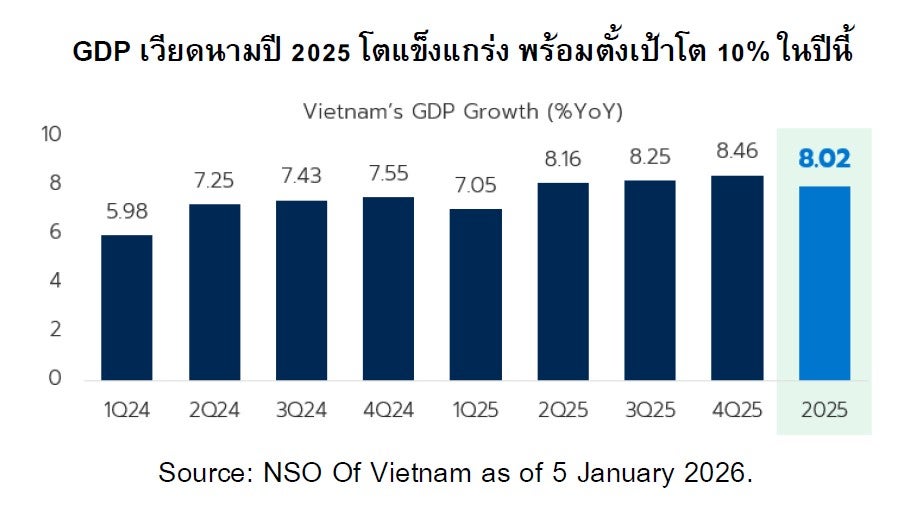 หากมองไประยะกลางถึงยาวตลาดหุ้นเวียดนามยังคงมีแนวโน้มการเติบโตที่ดีจากปัจจัยพื้นฐานภายในประเทศที่แข็งแกร่ง โดยเฉพาะด้านเศรษฐกิจที่ขยายตัวต่อเนื่อง โดย GDP เวียดนามปี 2025 เติบโตถึง 8.02% YoY เป็นระดับสูงสุดในกลุ่มประเทศในเอเชียตะวันออกเฉียงใต้ จากแรงหนุนทั้งภาคการบริโภค การลงทุนภาคเอกชน การลงทุนจากภาครัฐ การส่งออก และการลงทุนโดยตรงจากต่างประเทศที่เติบโตแข็งแกร่ง และในปีนี้รัฐบาลเวียดนามตั้งเป้าการเติบโตของเศรษฐกิจถึง 10%