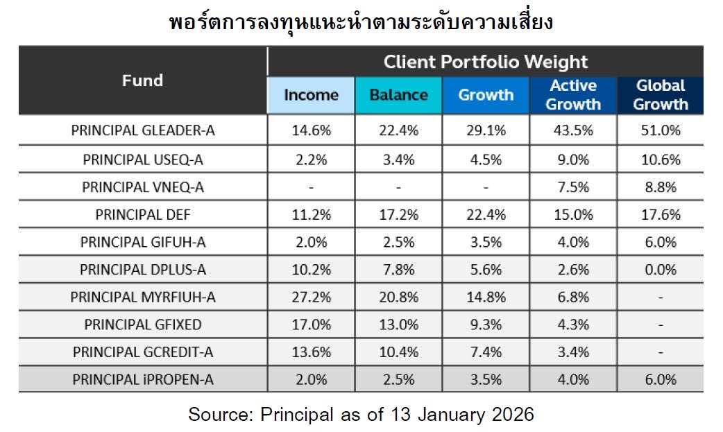 • ทั้งนี้หากท่านผู้ลงทุนมีความประสงค์จะลงทุนในพอร์ตลงทุนที่มีระดับความเสี่ยงสูงกว่าระดับความเสี่ยงการลงทุนของท่าน ท่านจะต้อง “ยืนยัน” รับทราบความเสี่ยงของพอร์ตลงทุนที่ท่านได้เลือกลงทุนผู้ลงทุนควรทำความเข้าใจลักษณะสินค้า (กองทุน) เงื่อนไข ผลตอบแทนและความเสี่ยงก่อนตัดสินใจลงทุน / PRINCIPAL GCREDIT, PRINCIPAL USEQ กองทุนหลักลงทุนกระจุกตัวในประเทศสหรัฐอเมริกา ผู้ลงทุนจึงควรพิจารณาการกระจายความเสี่ยงของพอร์ตการลงทุนโดยรวมของตนเองด้วย / PRINCIPAL GLEADER และ PRINCIPAL GIFUH กองทุนหลักลงทุนกระจุกตัวในอเมริกาเหนือ และยุโรปผู้ลงทุนจึงควรพิจารณาการกระจายความเสี่ยงของพอร์ตการลงทุนโดยรวมของตนเองด้วย / PRINCIPAL MYRFIUH กองทุนหลักลงทุนลงทุนกระจุกตัวในประเทศมาเลเซีย ผู้ลงทุนจึงควรพิจารณาการกระจายความเสี่ยงของพอร์ตการลงทุนโดยรวมของตนเองด้วย / PRINCIPAL iPROPEN ลงทุนกระจุกตัวในประเทศแถบเอเชีย ผู้ลงทุนจึงควรพิจารณาการกระจายความเสี่ยงของพอร์ตการลงทุนโดยรวมของตนเองด้วย / PRINCIPAL VNEQ ลงทุนกระจุกตัวในประเทศเวียดนาม ผู้ลงทุนจึงควรพิจารณาการกระจายความเสี่ยงของพอร์ตการลงทุนโดยรวมของตนเองด้วย / PRINCIPAL DEF นี้มีการกระจุกตัวของการถือหน่วยการลงทุนจากบุคคลหรือกลุ่มบุคคลใดที่ถือหน่วยการลงทุนเกิน 1 ใน 3 เป็นสัดส่วนร้อยละ 75.60 (ณ วันที่ 31 ต.ค. 2568) โดยสามารถตรวจสอบข้อมูลผ่านเว็บไซด์ของบริษัทจัดการ (www.principal.th) / PRINCIPAL DPLUS มีการลงทุนในต่างประเทศบางส่วนซึ่งจะไม่เกินร้อยละ 79 ของมูลค่าทรัพย์สินสุทธิ จึงอาจทำให้กองทุนมีความเสี่ยงจากอัตราแลกเปลี่ยนสกุลเงินบาทและสกุลเงินต่างประเทศอื่น ๆ ดังนั้น บริษัทจัดการจะลงทุนในสัญญาซื้อขายล่วงหน้าเพื่อป้องกันความเสี่ยงจากอัตราแลกเปลี่ยน (Hedging) ไม่น้อยกว่าร้อยละ 90 ของมูลค่าทรัพย์สินที่ลงทุน ณ ต่างประเทศ เพื่อป้องกันความเสี่ยงดังกล่าว / PRINCIPAL MYRFIUH และ PRINCIPAL GIFUH จะไม่ป้องกันความเสี่ยงด้านอัตราแลกเปลี่ยนเงินตราต่างประเทศ (unhedged) ดังนั้นกองทุนจึงมีความเสี่ยงด้านอัตราแลกเปลี่ยนซึ่งอาจทำให้ผู้ลงทุนได้รับผลขาดทุนจากอัตราแลกเปลี่ยนหรือได้รับเงินคืนต่ำกว่าเงินลงทุนเริ่มแรกได้ / PRINCIPAL iPROPEN เน้นลงทุนในหน่วยลงทุนของกองทุนรวมอสังหาริมทรัพย์และ/หรือทรัสต์เพื่อการลงทุนในอสังหาริมทรัพย์(REITs) และ/หรือกองทุนรวม โครงสร้างพื้นฐาน ซึ่งกองทุนดังกล่าวมีความเสี่ยงในลักษณะเดียวกับการลงทุนในธุรกิจอสังหาริมทรัพย์หรือโครงสร้างพื้นฐานโดยตรง เช่น ความเสี่ยงจากความผันแปรของค่าเช่าและอัตราการเช่า การเพิ่มขึ้นของภาษีทรัพย์สิน การเปลี่ยนแปลงของกฎหมายหรือกฎระเบียบที่เกี่ยวข้อง