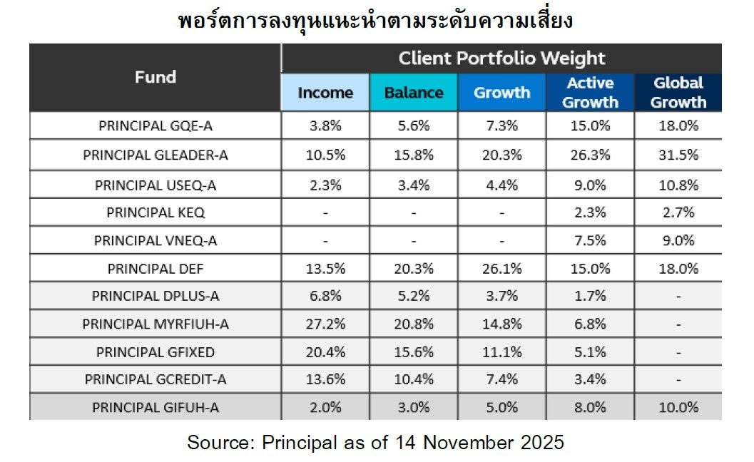 จากปัจจัยข้างต้นทำให้ภาพรวมตลาดหุ้นไทยมีแนวโน้มในเชิงบวก และมีความเสี่ยงขาลงที่จำกัด บลจ.พรินซิเพิล แนะนำทยอยสะสมกองทุนหุ้นไทยผ่าน PRINCIPAL DEF ที่ได้รับรางวัลกองทุนยอดเยี่ยมแห่งปีจากงาน Money & Banking Awards 2 ปีติดต่อกัน (2567-2568) หรือ PRINCIPAL iDIV เพื่อเตรียมรับปัจจัยบวกดังกล่าว โดยนักลงทุนสามารถอ้างอิงน้ำหนักการลงทุนที่เหมาะสมได้จากพอร์ตลงทุนแนะนำในหน้าที่ 2