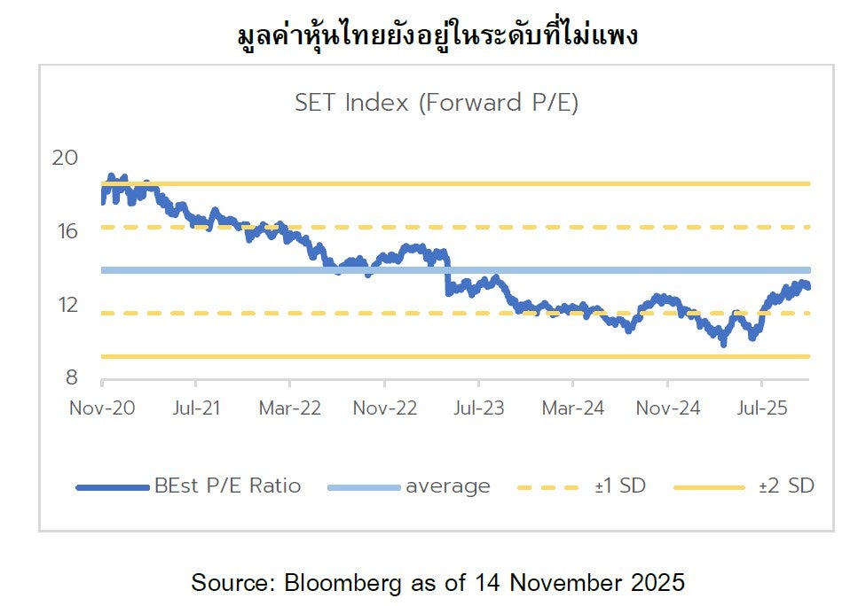 โดยในช่วงที่เหลือของปี ตลาดหุ้นไทยยังคงมีปัจจัยหนุนทั้งจากผลของมาตรการกระตุ้นเศรษฐกิจของภาครัฐ แรงขายของนักลงทุนต่างชาติที่เริ่มเบาบางลง และการใช้นโยบายทางการเงินที่ผ่อนคลาย โดยจากอัตราเงินเฟ้อที่ยังคงอยู่ในระดับต่ำเปิดทางให้ธนาคารแห่งประเทศไทย (ธปท.) สามารถใช้นโยบายการเงินแบบผ่อนคลายเพิ่มเติมเพื่อกระตุ้นเศรษฐกิจ อีกทั้งผลการสำรวจดัชนีความเชื่อมั่นนักลงทุนในอีก 3 เดือนข้างหน้าคงอยู่ในเกณฑ์ร้อนแรง (Bullish) ทั้งในกลุ่มนักลงทุนบุคคล บัญชีบริษัทหลักทรัพย์ นักลงทุนสถาบัน และนักลงทุนต่างประเทศ สะท้อนว่าตลาดหุ้นไทยยังคงน่าสนใจในสายตาของนักลงทุนและมีแนวโน้มฟื้นตัวได้ดีขึ้นในระยะข้างหน้า (Source: FETCO as of October 2025)