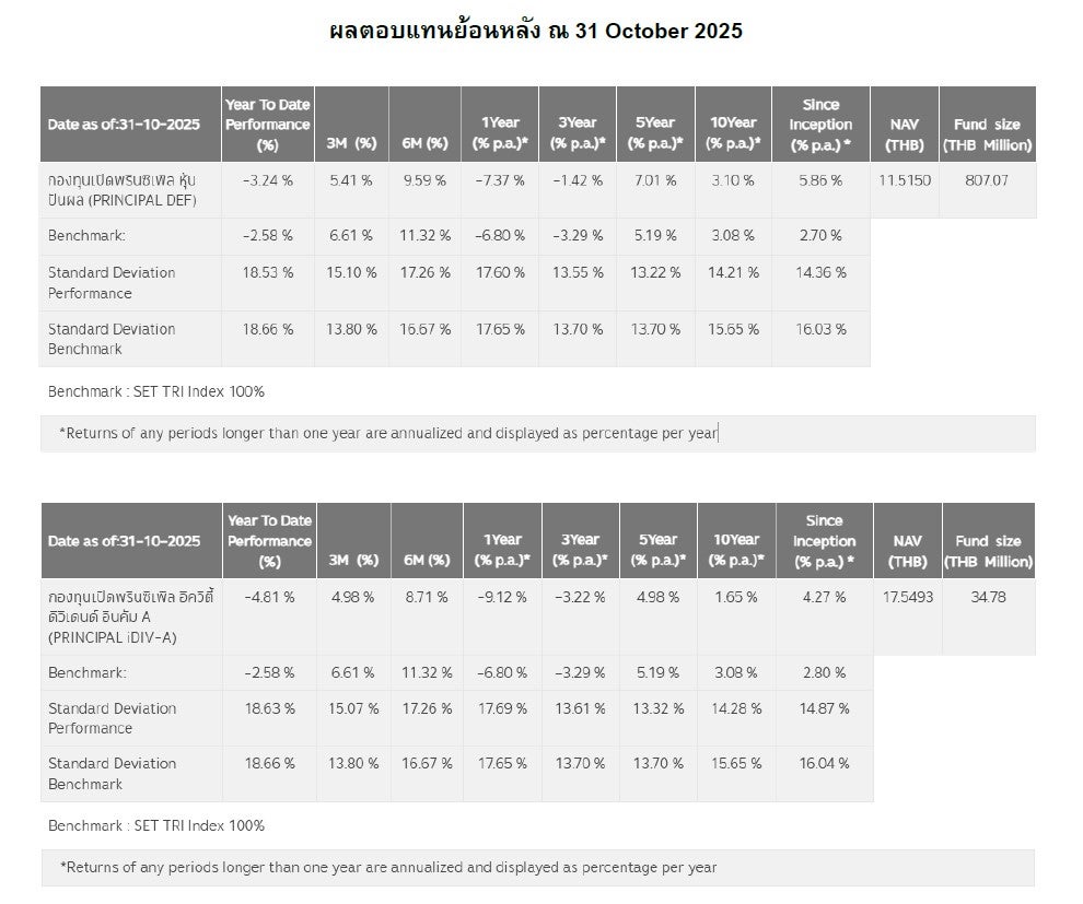 ผู้ลงทุนควรทำความเข้าใจลักษณะสินค้า (กองทุน) เงื่อนไข ผลตอบแทนและความเสี่ยงก่อนตัดสินใจลงทุน / PRINCIPAL GQE, PRINCIPAL GCREDIT, PRINCIPAL USEQ กองทุนหลักลงทุนกระจุกตัวในประเทศสหรัฐอเมริกา ผู้ลงทุนจึงควรพิจารณาการกระจายความเสี่ยงของพอร์ตการลงทุนโดยรวมของตนเองด้วย / PRINCIPAL GLEADER และ PRINCIPAL GIFUH กองทุนหลักลงทุนกระจุกตัวในอเมริกาเหนือ และยุโรปผู้ลงทุนจึงควรพิจารณาการกระจายความเสี่ยงของพอร์ตการลงทุนโดยรวมของตนเองด้วย / PRINCIPAL MYRFIUH กองทุนหลักลงทุนลงทุนกระจุกตัวในประเทศมาเลเซีย ผู้ลงทุนจึงควรพิจารณาการกระจายความเสี่ยงของพอร์ตการลงทุนโดยรวมของตนเองด้วย / PRINCIPAL VNEQ ลงทุนกระจุกตัวในประเทศเวียดนาม ผู้ลงทุนจึงควรพิจารณาการกระจายความเสี่ยงของพอร์ตการลงทุนโดยรวมของตนเองด้วย / PRINCIPAL KEQ ลงทุนกระจุกตัวในประเทศเกาหลีผู้ลงทุนจึงควรพิจารณาการกระจายความเสี่ยงของพอร์ตการลงทุนโดยรวมของตนเองด้วย / PRINCIPAL DEF นี้มีการกระจุกตัวของการถือหน่วยการลงทุนจากบุคคลหรือกลุ่มบุคคลใดที่ถือหน่วยการลงทุนเกิน 1 ใน 3 เป็นสัดส่วนร้อยละ 75.60 (ณ วันที่ 31 ต.ค. 2568) โดยสามารถตรวจสอบข้อมูลผ่านเว็บไซด์ของบริษัทจัดการ (www.principal.th) / PRINCIPAL DPLUS มีการลงทุนในต่างประเทศบางส่วนซึ่งจะไม่เกินร้อยละ 79 ของมูลค่าทรัพย์สินสุทธิ จึงอาจทำให้กองทุนมีความเสี่ยงจากอัตราแลกเปลี่ยนสกุลเงินบาทและสกุลเงินต่างประเทศอื่น ๆ ดังนั้น บริษัทจัดการจะลงทุนในสัญญาซื้อขายล่วงหน้าเพื่อป้องกันความเสี่ยงจากอัตราแลกเปลี่ยน (Hedging) ไม่น้อยกว่าร้อยละ 90 ของมูลค่าทรัพย์สินที่ลงทุน ณ ต่างประเทศ เพื่อป้องกันความเสี่ยงดังกล่าว / PRINCIPAL MYRFIUH และ PRINCIPAL GIFUH จะไม่ป้องกันความเสี่ยงด้านอัตราแลกเปลี่ยนเงินตราต่างประเทศ (unhedged) ดังนั้นกองทุนจึงมีความเสี่ยงด้านอัตราแลกเปลี่ยนซึ่งอาจทำให้ผู้ลงทุนได้รับผลขาดทุนจากอัตราแลกเปลี่ยนหรือได้รับเงินคืนต่ำกว่าเงินลงทุนเริ่มแรกได้ / บริษัทจัดการใช้สัญญาซื้อขายล่วงหน้าเพื่อเป็นเครื่องมือในการป้องกันความเสี่ยงด้านอัตราแลกเปลี่ยนของกองทุน (Hedging) ขึ้นอยู่กับดุลยพินิจของผู้จัดการกองทุน / กองทุนมีนโยบายลงทุนในต่างประเทศ กองทุนอาจมีความเสี่ยงด้านอัตราแลกเปลี่ยน ผู้ลงทุนอาจขาดทุนหรือได้รับกำไร จากอัตราแลกเปลี่ยน/หรือได้รับเงินคืนต่ำกว่าทุนเริ่มแรกได้ /ผู้ลงทุนควรศึกษาผลการดำเนินงานของหน่วยลงทุนแต่ละชนิดของกองทุนใน https://www.principal.th/th/mutual-fundth ก่อนตัดสินใจลงทุน / ผลการดำเนินงานในอดีตมิได้เป็นสิ่งยืนยันถึงผลการดำเนินงานในอนาคต