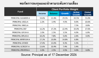 ผู้ลงทุนควรทำความเข้าใจลักษณะสินค้า (กองทุน) เงื่อนไข ผลตอบแทนและความเสี่ยงก่อนตัดสินใจลงทุน / PRINCIPAL GCREDIT, PRINCIPAL USEQ กองทุนหลักลงทุนกระจุกตัวในประเทศสหรัฐอเมริกา ผู้ลงทุนจึงควรพิจารณาการกระจายความเสี่ยงของพอร์ตการลงทุนโดยรวมของตนเองด้วย / PRINCIPAL GLEADER และ PRINCIPAL GIFUH กองทุนหลักลงทุนกระจุกตัวในอเมริกาเหนือ และยุโรปผู้ลงทุนจึงควรพิจารณาการกระจายความเสี่ยงของพอร์ตการลงทุนโดยรวมของตนเองด้วย / PRINCIPAL MYRFIUH กองทุนหลักลงทุนลงทุนกระจุกตัวในประเทศมาเลเซีย ผู้ลงทุนจึงควรพิจารณาการกระจายความเสี่ยงของพอร์ตการลงทุนโดยรวมของตนเองด้วย / PRINCIPAL iPROPEN ลงทุนกระจุกตัวในประเทศแถบเอเชีย ผู้ลงทุนจึงควรพิจารณาการกระจายความเสี่ยงของพอร์ตการลงทุนโดยรวมของตนเองด้วย / PRINCIPAL VNEQ ลงทุนกระจุกตัวในประเทศเวียดนาม ผู้ลงทุนจึงควรพิจารณาการกระจายความเสี่ยงของพอร์ตการลงทุนโดยรวมของตนเองด้วย / PRINCIPAL DEF นี้มีการกระจุกตัวของการถือหน่วยการลงทุนจากบุคคลหรือกลุ่มบุคคลใดที่ถือหน่วยการลงทุนเกิน 1 ใน 3 เป็นสัดส่วนร้อยละ 75.60 (ณ วันที่ 31 ต.ค. 2568) โดยสามารถตรวจสอบข้อมูลผ่านเว็บไซด์ของบริษัทจัดการ (www.principal.th) / PRINCIPAL DPLUS มีการลงทุนในต่างประเทศบางส่วนซึ่งจะไม่เกินร้อยละ 79 ของมูลค่าทรัพย์สินสุทธิ จึงอาจทำให้กองทุนมีความเสี่ยงจากอัตราแลกเปลี่ยนสกุลเงินบาทและสกุลเงินต่างประเทศอื่น ๆ ดังนั้น บริษัทจัดการจะลงทุนในสัญญาซื้อขายล่วงหน้าเพื่อป้องกันความเสี่ยงจากอัตราแลกเปลี่ยน (Hedging) ไม่น้อยกว่าร้อยละ 90 ของมูลค่าทรัพย์สินที่ลงทุน ณ ต่างประเทศ เพื่อป้องกันความเสี่ยงดังกล่าว / PRINCIPAL MYRFIUH และ PRINCIPAL GIFUH จะไม่ป้องกันความเสี่ยงด้านอัตราแลกเปลี่ยนเงินตราต่างประเทศ (unhedged) ดังนั้นกองทุนจึงมีความเสี่ยงด้านอัตราแลกเปลี่ยนซึ่งอาจทำให้ผู้ลงทุนได้รับผลขาดทุนจากอัตราแลกเปลี่ยนหรือได้รับเงินคืนต่ำกว่าเงินลงทุนเริ่มแรกได้ / PRINCIPAL iPROPEN เน้นลงทุนในหน่วยลงทุนของกองทุนรวมอสังหาริมทรัพย์และ/หรือทรัสต์เพื่อการลงทุนในอสังหาริมทรัพย์(REITs) และ/หรือกองทุนรวม โครงสร้างพื้นฐาน ซึ่งกองทุนดังกล่าวมีความเสี่ยงในลักษณะเดียวกับการลงทุนในธุรกิจอสังหาริมทรัพย์หรือโครงสร้างพื้นฐานโดยตรง เช่น ความเสี่ยงจากความผันแปรของค่าเช่าและอัตราการเช่า การเพิ่มขึ้นของภาษีทรัพย์สิน การเปลี่ยนแปลงของกฎหมายหรือกฎระเบียบที่เกี่ยวข้อง ความเสี่ยงด้านสิ่งแวดล้อม ความเสี่ยงจากภัยธรรมชาติ ค่าเสื่อมราคาของอาคารเมื่อเวลาผ่านไป และการเพิ่มขึ้นของอัตราดอกเบี้ย เป็นต้น รวมถึงความเสี่ยงจากการกระจุกตัวอาจทำให้มี ความผันผวนมากกว