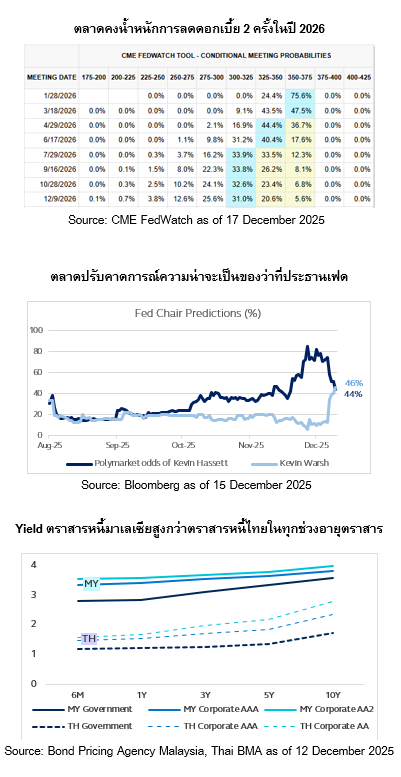 - อีกประเด็นที่ตลาดจับตามองคือว่าที่ประธานเฟดท่านใหม่ ซึ่งคาดว่าจะมีการประกาศชื่อผู้ที่จะเข้ารับตำแหน่งในช่วงต้นปี 2026 ซึ่งปัจจุบันโอกาสความน่าจะเป็นมีความใกล้เคียงกันระหว่าง Kevin Warsh ที่มีแนวคิด Moderate เน้นการรักษาเสถียรภาพทางการเงิน และ Kevin Hassett ที่มีแนวคิดค่อนไปในทาง Dovish หรือต้องการให้ดอกเบี้ยอยู่ในระดับต่ำ อย่างไรก็ตามทิศทางนโยบายการเงินของธนาคารกลางหลักทั่วโลก ในระยะข้างหน้ายังคงมีแนวโน้มที่จะมีการปรับลดอัตราดอกเบี้ยเพื่อให้เข้าสู่ระดับ Neutral rate หลังอัตราเงินเฟ้อเริ่มกลับเข้าสู่กรอบเป้าหมายของธนาคารกลาง