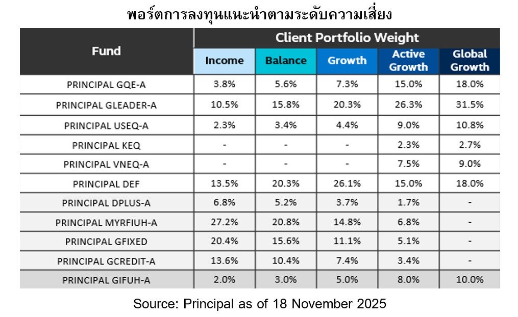 ผู้ลงทุนควรทำความเข้าใจลักษณะสินค้า (กองทุน) เงื่อนไข ผลตอบแทนและความเสี่ยงก่อนตัดสินใจลงทุน / PRINCIPAL GQE, PRINCIPAL GCREDIT, PRINCIPAL USEQ กองทุนหลักลงทุนกระจุกตัวในประเทศสหรัฐอเมริกา ผู้ลงทุนจึงควรพิจารณาการกระจายความเสี่ยงของพอร์ตการลงทุนโดยรวมของตนเองด้วย / PRINCIPAL GLEADER และ PRINCIPAL GIFUH กองทุนหลักลงทุนกระจุกตัวในอเมริกาเหนือ และยุโรปผู้ลงทุนจึงควรพิจารณาการกระจายความเสี่ยงของพอร์ตการลงทุนโดยรวมของตนเองด้วย / PRINCIPAL MYRFIUH กองทุนหลักลงทุนลงทุนกระจุกตัวในประเทศมาเลเซีย ผู้ลงทุนจึงควรพิจารณาการกระจายความเสี่ยงของพอร์ตการลงทุนโดยรวมของตนเองด้วย / PRINCIPAL VNEQ ลงทุนกระจุกตัวในประเทศเวียดนาม ผู้ลงทุนจึงควรพิจารณาการกระจายความเสี่ยงของพอร์ตการลงทุนโดยรวมของตนเองด้วย / PRINCIPAL KEQ ลงทุนกระจุกตัวในประเทศเกาหลีผู้ลงทุนจึงควรพิจารณาการกระจายความเสี่ยงของพอร์ตการลงทุนโดยรวมของตนเองด้วย / PRINCIPAL DEF นี้มีการกระจุกตัวของการถือหน่วยการลงทุนจากบุคคลหรือกลุ่มบุคคลใดที่ถือหน่วยการลงทุนเกิน 1 ใน 3 เป็นสัดส่วนร้อยละ 75.60 (ณ วันที่ 31 ต.ค. 2568) โดยสามารถตรวจสอบข้อมูลผ่านเว็บไซด์ของบริษัทจัดการ (www.principal.th) / PRINCIPAL DPLUS มีการลงทุนในต่างประเทศบางส่วนซึ่งจะไม่เกินร้อยละ 79 ของมูลค่าทรัพย์สินสุทธิ จึงอาจทำให้กองทุนมีความเสี่ยงจากอัตราแลกเปลี่ยนสกุลเงินบาทและสกุลเงินต่างประเทศอื่น ๆ ดังนั้น บริษัทจัดการจะลงทุนในสัญญาซื้อขายล่วงหน้าเพื่อป้องกันความเสี่ยงจากอัตราแลกเปลี่ยน (Hedging) ไม่น้อยกว่าร้อยละ 90 ของมูลค่าทรัพย์สินที่ลงทุน ณ ต่างประเทศ เพื่อป้องกันความเสี่ยงดังกล่าว / PRINCIPAL MYRFIUH และ PRINCIPAL GIFUH จะไม่ป้องกันความเสี่ยงด้านอัตราแลกเปลี่ยนเงินตราต่างประเทศ (unhedged) ดังนั้นกองทุนจึงมีความเสี่ยงด้านอัตราแลกเปลี่ยนซึ่งอาจทำให้ผู้ลงทุนได้รับผลขาดทุนจากอัตราแลกเปลี่ยนหรือได้รับเงินคืนต่ำกว่าเงินลงทุนเริ่มแรกได้ / บริษัทจัดการใช้สัญญาซื้อขายล่วงหน้าเพื่อเป็นเครื่องมือในการป้องกันความเสี่ยงด้านอัตราแลกเปลี่ยนของกองทุน (Hedging) ขึ้นอยู่กับดุลยพินิจของผู้จัดการกองทุน / กองทุนมีนโยบายลงทุนในต่างประเทศ กองทุนอาจมีความเสี่ยงด้านอัตราแลกเปลี่ยน ผู้ลงทุนอาจขาดทุนหรือได้รับกำไร จากอัตราแลกเปลี่ยน/หรือได้รับเงินคืนต่ำกว่าทุนเริ่มแรกได้ /ผู้ลงทุนควรศึกษาผลการดำเนินงานของหน่วยลงทุนแต่ละชนิดของกองทุนใน https://www.principal.th/th/mutual-fundth ก่อนตัดสินใจลงทุน / ผลการดำเนินงานในอดีตมิได้เป็นสิ่งยืนยันถึงผลการดำเนินงานในอนาคต
