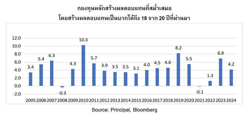 กองทุนหลัก (Principal Lifetime Bond) สามารถสร้างผลตอบแทนที่สม่ำเสมอ โดยสร้างผลตอบแทนเป็นบวกได้ถึง 18 จาก 20 ปีที่ผ่านมา ในปี 2010 กองทุนสามารถสร้างผลตอบแทนสูงสุดอยู่ที่ 10.3% และในปี 2023 ให้ผลตอบแทน ที่ 6.9% และแม้ในช่วงภาวะตลาดที่ท้าทาย เช่น วิกฤตการเงินโลกในปี 2008 กองทุนติดลบเพียง 0.3% ขณะที่ในปี 2021 ซึ่งเป็นช่วงที่อัตราดอกเบี้ยปรับตัวขึ้นอย่างรวดเร็ว กองทุนติดลบเพียง 0.1% เท่านั้น สะท้อนถึงการบริหารความเสี่ยงอย่างมีประสิทธิภาพ โดยผลตอบแทน (YTD) ในปีนี้ กองทุนปรับขึ้นได้ถึง 4.62% (Data as of 31 October 2025) โดยนักลงทุนสามารถอ้างอิงน้ำหนักการลงทุนที่เหมาะสมได้ตามพอร์ตการลงทุนแนะนำตามระดับความเสี่ยงในหน้าที่ 2 หรือคลิกที่นี่เพื่ออ่านข้อมูลเพิ่มเติม