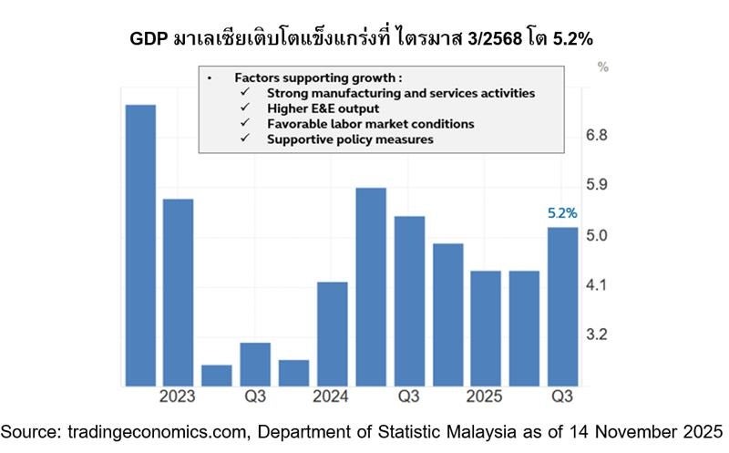 ในไตรมาส 3/2568 เศรษฐกิจของมาเลเซีย (GDP Growth) เติบโตได้แข็งแกร่งที่ 5.2% YoY สอดคล้องกับที่ทางธนาคารกลางมาเลเซีย (BNM) คาดการณ์ และถือว่าเป็นไตรมาสที่เติบโตสูงที่สุดของปีนี้ โดยได้รับแรงหนุนจากการบริโภคภายในประเทศ และการเติบโตของภาคการผลิตและการบริการ รวมถึงนโยบายกระตุ้นเศรษฐกิจของรัฐบาล โดยในอนาคตการเติบโตของเศรษฐกิจจะถูกหนุนจากความต้องการสินค้าอิเล็กทรอนิกส์ การท่องเที่ยว และการส่งออกที่กำลังฟื้นตัวเป็นหลัก โดยการเติบโตดังกล่าวสอดคล้องกับเป้าหมายการเติบโตของเศรษฐกิจทั้งปีนี้ของธนาคารกลางมาเลเซียที่ 4 – 4.8%