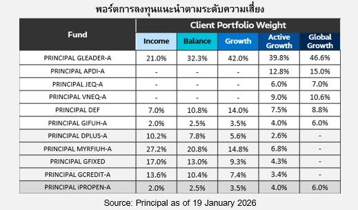 • ทั้งนี้หากท่านผู้ลงทุนมีความประสงค์จะลงทุนในพอร์ตลงทุนที่มีระดับความเสี่ยงสูงกว่าระดับความเสี่ยงการลงทุนของท่าน ท่านจะต้อง “ยืนยัน” รับทราบความเสี่ยงของพอร์ตลงทุนที่ท่านได้เลือกลงทุนผู้ลงทุนควรทำความเข้าใจลักษณะสินค้า (กองทุน) เงื่อนไข ผลตอบแทนและความเสี่ยงก่อนตัดสินใจลงทุน / PRINCIPAL GCREDIT, PRINCIPAL USEQ กองทุนหลักลงทุนกระจุกตัวในประเทศสหรัฐอเมริกา ผู้ลงทุนจึงควรพิจารณาการกระจายความเสี่ยงของพอร์ตการลงทุนโดยรวมของตนเองด้วย / PRINCIPAL GLEADER และ PRINCIPAL GIFUH กองทุนหลักลงทุนกระจุกตัวในอเมริกาเหนือ และยุโรปผู้ลงทุนจึงควรพิจารณาการกระจายความเสี่ยงของพอร์ตการลงทุนโดยรวมของตนเองด้วย / PRINCIPAL MYRFIUH กองทุนหลักลงทุนลงทุนกระจุกตัวในประเทศมาเลเซีย ผู้ลงทุนจึงควรพิจารณาการกระจายความเสี่ยงของพอร์ตการลงทุนโดยรวมของตนเองด้วย / PRINCIPAL iPROPEN, PRINCIPAL APDI ลงทุนกระจุกตัวในประเทศแถบเอเชีย ผู้ลงทุนจึงควรพิจารณาการกระจายความเสี่ยงของพอร์ตการลงทุนโดยรวมของตนเองด้วย / PRINCIPAL VNEQ ลงทุนกระจุกตัวในประเทศเวียดนาม ผู้ลงทุนจึงควรพิจารณาการกระจายความเสี่ยงของพอร์ตการลงทุนโดยรวมของตนเองด้วย / PRINCIPAL GIFUH กองทุนหลักลงทุนกระจุกตัวในยุโรป และอเมริกาเหนือ ผู้ลงทุนจึงควรพิจารณาการกระจายความเสี่ยงของพอร์ตการลงทุนโดยรวมของตนเองด้วย / PRINCIPAL JEQ ลงทุนกระจุกตัวในประเทศญี่ปุ่นผู้ลงทุนจึงควรพิจารณาการกระจายความเสี่ยงของพอร์ตการลงทุนโดยรวมของตนเองด้วย / PRINCIPAL DEF นี้มีการกระจุกตัวของการถือหน่วยการลงทุนจากบุคคลหรือกลุ่มบุคคลใดที่ถือหน่วยการลงทุนเกิน 1 ใน 3 เป็นสัดส่วนร้อยละ 76.16 (ณ วันที่ 30 ธ.ค. 2568) โดยสามารถตรวจสอบข้อมูลผ่านเว็บไซด์ของบริษัทจัดการ (www.principal.th) / PRINCIPAL DPLUS มีการลงทุนในต่างประเทศบางส่วนซึ่งจะไม่เกินร้อยละ 79 ของมูลค่าทรัพย์สินสุทธิ จึงอาจทำให้กองทุนมีความเสี่ยงจากอัตราแลกเปลี่ยนสกุลเงินบาทและสกุลเงินต่างประเทศอื่น ๆ ดังนั้น บริษัทจัดการจะลงทุนในสัญญาซื้อขายล่วงหน้าเพื่อป้องกันความเสี่ยงจากอัตราแลกเปลี่ยน (Hedging) ไม่น้อยกว่าร้อยละ 90 ของมูลค่าทรัพย์สินที่ลงทุน ณ ต่างประเทศ เพื่อป้องกันความเสี่ยงดังกล่าว / PRINCIPAL MYRFIUH และ PRINCIPAL GIFUH จะไม่ป้องกันความเสี่ยงด้านอัตราแลกเปลี่ยนเงินตราต่างประเทศ (unhedged) ดังนั้นกองทุนจึงมีความเสี่ยงด้านอัตราแลกเปลี่ยนซึ่งอาจทำให้ผู้ลงทุนได้รับผลขาดทุนจากอัตราแลกเปลี่ยนหรือได้รับเงินคืนต่ำกว่าเงินลงทุนเริ่มแรกได้ / PRINCIPAL iPROPEN เน้นลงทุนในหน่วยลงทุนของกองทุนรวมอสังหาริมทรัพย์และ/หรือทรัสต์เพื่อการลงทุนในอสังหาริมทรัพย์(REITs) และ/หรือกองทุนรวม โครงสร้า