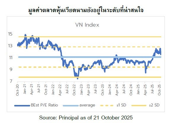 นอกจากนี้กำไรบริษัทจดทะเบียนโดยรวมยังคงเติบโตแข็งแกร่ง และมูลค่าของตลาดหุ้นเวียดนามในปัจจุบันยังอยู่ในระดับน่าสนใจ โดยมี Forward P/E ที่ 11.62 เท่า หรือราว +0.3 SD เมื่อเทียบกับค่าเฉลี่ยย้อนหลัง 5 ปี ซึ่งเป็นระดับราคาที่ยังไม่แพง (Source: Bloomberg as of 21 October 2025)