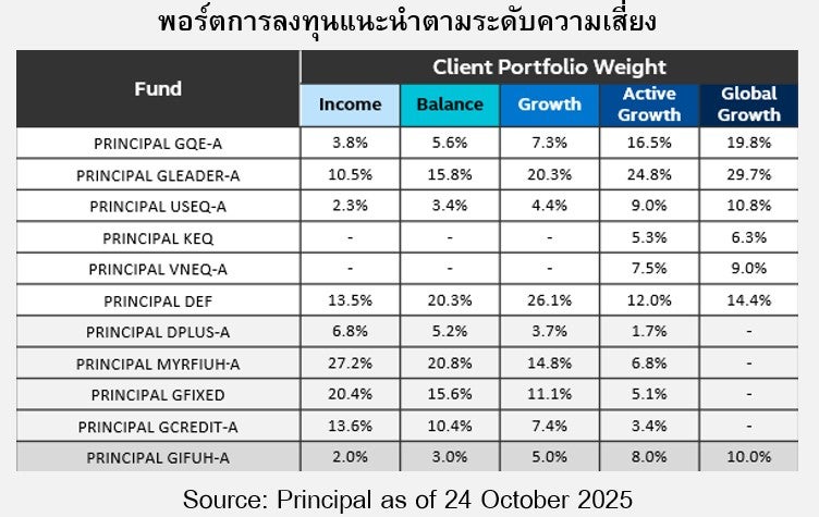 คำเตือน: Principal Asset Allocation Plan เป็นบริการการแนะนำการจัดพอร์ตการลงทุนแบบการกระจายการลงทุนไปในสินทรัพย์ต่าง ๆ (Asset Allocation) ตามระดับความเสี่ยงในการลงทุนของผู้ลงทุน โดยเป็นการพิจารณาและประเมินภาวะการลงทุน เพื่อการสร้างและปรับพอร์ตอย่างสมดุล และอาจจะพิจารณาและนำเสนอการปรับเปลี่ยนสัดส่วนการลงทุนหรือปรับพอร์ตลงทุนเป็นรายเดือน เพื่อให้มั่นใจได้ว่าพอร์ตการลงทุนมีการกระจายความเสี่ยงอย่างเหมาะสมและสอดรับกับภาวะการลงทุน เนื่องจากการเปลี่ยนแปลงของราคาที่เปลี่ยนไปตามภาวะตลาดส่งผลให้สัดส่วนของแต่ละสินทรัพย์ที่ลงทุนมีการปรับเปลี่ยนไปจากสัดส่วนการลงทุนที่เหมาะสม อาจทำให้พอร์ตการลงทุนมีความเสี่ยงสูงหรือต่ำไปกว่าที่ควรจะเป็น เพื่อให้สัดส่วนการลงทุนเข้าสู่สัดส่วนการลงทุนที่เหมาะสม Principal Asset Allocation Plan เป็นเพียงคำแนะนำของ บริษัทจัดการ ผู้ลงทุนอาจไม่ได้รับผลตอบแทนตามคาดหวัง ทั้งนี้ ผู้ลงทุนควรทำความเข้าใจการจัดสรรการลงทุน (Basic Asset Allocation) ตามคำแนะนำของสำนักงาน ก.ล.ต.