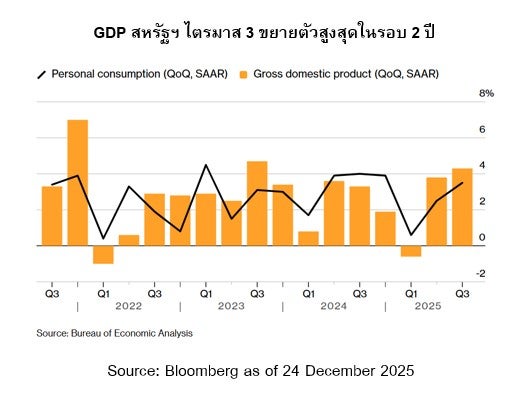 กระทรวงพาณิชย์สหรัฐฯ เปิดเผยตัวเลข GDP ไตรมาส 3 ปี 2568 ขยายตัว 4.3% QoQ ซึ่งเป็นการขยายตัวสูงสุดนับตั้งแต่ไตรมาส 3 ปี 2566 สูงกว่าที่นักวิเคราะห์คาดการณ์ที่ 3.3% โดยมีแรงหนุนหลักจากภาคการใช้จ่ายของผู้บริโภค นอกจากนี้ยังได้เปิดเผยตัวเลขเงินเฟ้อพื้นฐาน (Core PCE) ไตรมาส 3 ปี 2568 ปรับตัวขึ้น 2.9% สอดคล้องกับที่นักวิเคราะห์คาดการณ์ และเงินเฟ้อทั่วไป (Headline PCE) ปรับตัวขึ้น 2.8% ต่ำกว่าที่นักวิเคราะห์คาดการณ์ที่ 2.9%