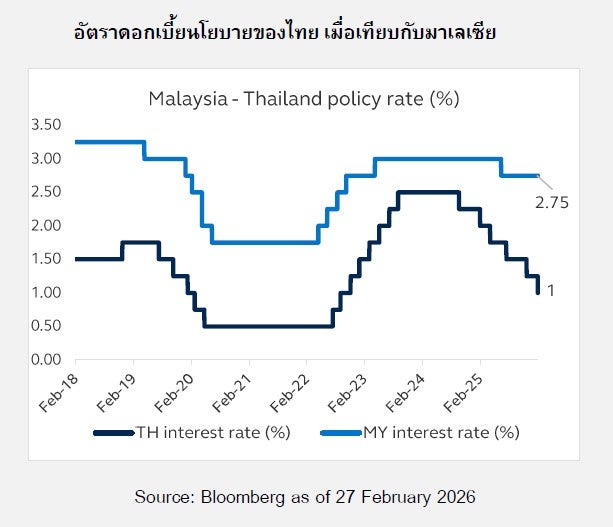 จากการปรับลดดังกล่าวส่งผลให้ตราสารหนี้มาเลเซียมีความน่าสนใจต่อการลงทุนมากขึ้นเชิงเปรียบเทียบ ในแง่ของ Policy Space และอัตราผลตอบแทน (Yield) โดยอัตราดอกเบี้ยนโยบายของมาเลเซียยังอยู่ในระดับสูงที่ 2.75% ส่งผลให้อัตราผลตอบแทนของตราสารหนี้ (Yield) โดยรวมมาเลเซียสูงกว่าไทย และมี Policy Space ต่อการลดดอกเบี้ยที่กว้างกว่าของไทยด้วย