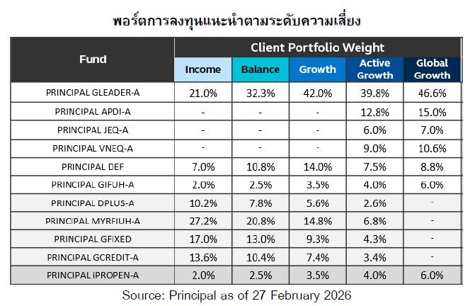 คำเตือน: Principal Asset Allocation Plan เป็นบริการการแนะนำการจัดพอร์ตการลงทุนแบบการกระจายการลงทุนไปในสินทรัพย์ต่าง ๆ (Asset Allocation) ตามระดับความเสี่ยงในการลงทุนของผู้ลงทุน โดยเป็นการพิจารณาและประเมินภาวะการลงทุน เพื่อการสร้างและปรับพอร์ตอย่างสมดุล และอาจจะพิจารณาและนำเสนอการปรับเปลี่ยนสัดส่วนการลงทุนหรือปรับพอร์ตลงทุนเป็นรายเดือน เพื่อให้มั่นใจได้ว่าพอร์ตการลงทุนมีการกระจายความเสี่ยงอย่างเหมาะสมและสอดรับกับภาวะการลงทุน เนื่องจากการเปลี่ยนแปลงของราคาที่เปลี่ยนไปตามภาวะตลาดส่งผลให้สัดส่วนของแต่ละสินทรัพย์ที่ลงทุนมีการปรับเปลี่ยนไปจากสัดส่วนการลงทุนที่เหมาะสม อาจทำให้พอร์ตการลงทุนมีความเสี่ยงสูงหรือต่ำไปกว่าที่ควรจะเป็น เพื่อให้สัดส่วนการลงทุนเข้าสู่สัดส่วนการลงทุนที่เหมาะสม Principal Asset Allocation Plan เป็นเพียงคำแนะนำของ บริษัทจัดการ ผู้ลงทุนอาจไม่ได้รับผลตอบแทนตามคาดหวัง ทั้งนี้ ผู้ลงทุนควรทำความเข้าใจการจัดสรรการลงทุน (Basic Asset Allocation) ตามคำแนะนำของสำนักงาน ก.ล.ต.