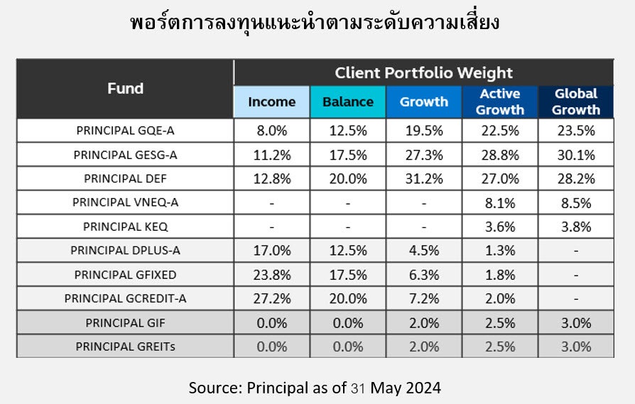 คำเตือน: Principal Asset Allocation Plan เป็นบริการการแนะนำการจัดพอร์ตการลงทุนแบบการกระจายการลงทุนไปในสินทรัพย์ต่าง ๆ (Asset Allocation) ตามระดับความเสี่ยงในการลงทุนของผู้ลงทุน โดยเป็นการพิจารณาและประเมินภาวะการลงทุน เพื่อการสร้างและปรับพอร์ตอย่างสมดุล และอาจจะพิจารณาและนำเสนอการปรับเปลี่ยนสัดส่วนการลงทุนหรือปรับพอร์ตลงทุนเป็นรายเดือน เพื่อให้มั่นใจได้ว่าพอร์ตการลงทุนมีการกระจายความเสี่ยงอย่างเหมาะสมและสอดรับกับภาวะการลงทุน เนื่องจากการเปลี่ยนแปลงของราคาที่เปลี่ยนไปตามภาวะตลาดส่งผลให้สัดส่วนของแต่ละสินทรัพย์ที่ลงทุนมีการปรับเปลี่ยนไปจากสัดส่วนการลงทุนที่เหมาะสม อาจทำให้พอร์ตการลงทุนมีความเสี่ยงสูงหรือต่ำไปกว่าที่ควรจะเป็น เพื่อให้สัดส่วนการลงทุนเข้าสู่สัดส่วนการลงทุนที่เหมาะสม Principal Asset Allocation Plan เป็นเพียงคำแนะนำของ บริษัทจัดการ ผู้ลงทุนอาจไม่ได้รับผลตอบแทนตามคาดหวัง ทั้งนี้ ผู้ลงทุนควรทำความเข้าใจการจัดสรรการลงทุน (Basic Asset Allocation) ตามคำแนะนำของสำนักงาน ก.ล.ต.