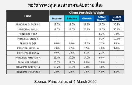 ผู้ลงทุนควรทำความเข้าใจลักษณะสินค้า (กองทุน) เงื่อนไข ผลตอบแทนและความเสี่ยงก่อนตัดสินใจลงทุน / PRINCIPAL GCREDIT กองทุนหลักลงทุนกระจุกตัวในประเทศสหรัฐอเมริกา และยุโรป ผู้ลงทุนจึงควรพิจารณาการกระจายความเสี่ยงของพอร์ตการลงทุนโดยรวมของตนเองด้วย / PRINCIPAL GLEADER และ PRINCIPAL GIFUH กองทุนหลักลงทุนกระจุกตัวในอเมริกาเหนือ และยุโรปผู้ลงทุนจึงควรพิจารณาการกระจายความเสี่ยงของพอร์ตการลงทุนโดยรวมของตนเองด้วย / PRINCIPAL MYRFIUH กองทุนหลักลงทุนลงทุนกระจุกตัวในประเทศมาเลเซีย ผู้ลงทุนจึงควรพิจารณาการกระจายความเสี่ยงของพอร์ตการลงทุนโดยรวมของตนเองด้วย / PRINCIPAL iPROPEN ลงทุนกระจุกตัวในประเทศแถบเอเชีย ผู้ลงทุนจึงควรพิจารณาการกระจายความเสี่ยงของพอร์ตการลงทุนโดยรวมของตนเองด้วย / PRINCIPAL INXUS ลงทุนกระจุกตัวในยุโรป ผู้ลงทุนจึงควรพิจารณาการกระจายความเสี่ยงของพอร์ตการลงทุนโดยรวมของตนเองด้วย / PRINCIPAL VNEQ ลงทุนกระจุกตัวในประเทศเวียดนาม ผู้ลงทุนจึงควรพิจารณาการกระจายความเสี่ยงของพอร์ตการลงทุนโดยรวมของตนเองด้วย / PRINCIPAL JEQ ลงทุนกระจุกตัวในประเทศญี่ปุ่นผู้ลงทุนจึงควรพิจารณาการกระจายความเสี่ยงของพอร์ตการลงทุนโดยรวมของตนเองด้วย / PRINCIPAL DEF นี้มีการกระจุกตัวของการถือหน่วยการลงทุนจากบุคคลหรือกลุ่มบุคคลใดที่ถือหน่วยการลงทุนเกิน 1 ใน 3 เป็นสัดส่วนร้อยละ 87.25 (ณ วันที่ 27 ก.พ. 2569) โดยสามารถตรวจสอบข้อมูลผ่านเว็บไซด์ของบริษัทจัดการ (www.principal.th) / PRINCIPAL DPLUS มีการลงทุนในต่างประเทศบางส่วนซึ่งจะไม่เกินร้อยละ 79 ของมูลค่าทรัพย์สินสุทธิ จึงอาจทำให้กองทุนมีความเสี่ยงจากอัตราแลกเปลี่ยนสกุลเงินบาทและสกุลเงินต่างประเทศอื่น ๆ ดังนั้น บริษัทจัดการจะลงทุนในสัญญาซื้อขายล่วงหน้าเพื่อป้องกันความเสี่ยงจากอัตราแลกเปลี่ยน (Hedging) ไม่น้อยกว่าร้อยละ 90 ของมูลค่าทรัพย์สินที่ลงทุน ณ ต่างประเทศ เพื่อป้องกันความเสี่ยงดังกล่าว / PRINCIPAL MYRFIUH และ PRINCIPAL GIFUH จะไม่ป้องกันความเสี่ยงด้านอัตราแลกเปลี่ยนเงินตราต่างประเทศ (unhedged) ดังนั้นกองทุนจึงมีความเสี่ยงด้านอัตราแลกเปลี่ยนซึ่งอาจทำให้ผู้ลงทุนได้รับผลขาดทุนจากอัตราแลกเปลี่ยนหรือได้รับเงินคืนต่ำกว่าเงินลงทุนเริ่มแรกได้ / PRINCIPAL iPROPEN เน้นลงทุนในหน่วยลงทุนของกองทุนรวมอสังหาริมทรัพย์และ/หรือทรัสต์เพื่อการลงทุนในอสังหาริมทรัพย์(REITs) และ/หรือกองทุนรวม โครงสร้างพื้นฐาน ซึ่งกองทุนดังกล่าวมีความเสี่ยงในลักษณะเดียวกับการลงทุนในธุรกิจอสังหาริมทรัพย์หรือโครงสร้างพื้นฐานโดยตรง เช่น ความเสี่ยงจากความผันแปรของค่าเช่าและอัตราการเช่า การเพิ่มขึ้นของภาษีทรัพย์สิน การเปลี่ยนแปลงของ