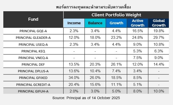 คำเตือน: Principal Asset Allocation Plan เป็นบริการการแนะนำการจัดพอร์ตการลงทุนแบบการกระจายการลงทุนไปในสินทรัพย์ต่าง ๆ (Asset Allocation) ตามระดับความเสี่ยงในการลงทุนของผู้ลงทุน โดยเป็นการพิจารณาและประเมินภาวะการลงทุน เพื่อการสร้างและปรับพอร์ตอย่างสมดุล และอาจจะพิจารณาและนำเสนอการปรับเปลี่ยนสัดส่วนการลงทุนหรือปรับพอร์ตลงทุนเป็นรายเดือน เพื่อให้มั่นใจได้ว่าพอร์ตการลงทุนมีการกระจายความเสี่ยงอย่างเหมาะสมและสอดรับกับภาวะการลงทุน เนื่องจากการเปลี่ยนแปลงของราคาที่เปลี่ยนไปตามภาวะตลาดส่งผลให้สัดส่วนของแต่ละสินทรัพย์ที่ลงทุนมีการปรับเปลี่ยนไปจากสัดส่วนการลงทุนที่เหมาะสม อาจทำให้พอร์ตการลงทุนมีความเสี่ยงสูงหรือต่ำไปกว่าที่ควรจะเป็น เพื่อให้สัดส่วนการลงทุนเข้าสู่สัดส่วนการลงทุนที่เหมาะสม Principal Asset Allocation Plan เป็นเพียงคำแนะนำของ บริษัทจัดการ ผู้ลงทุนอาจไม่ได้รับผลตอบแทนตามคาดหวัง ทั้งนี้ ผู้ลงทุนควรทำความเข้าใจการจัดสรรการลงทุน (Basic Asset Allocation) ตามคำแนะนำของสำนักงาน ก.ล.ต.