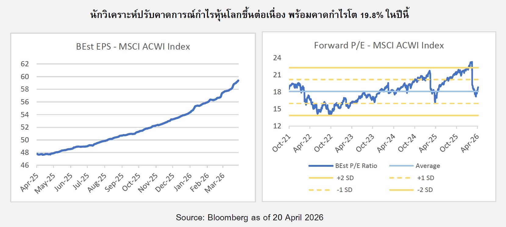 นักวิเคราะห์จาก Bloomberg Consensus ปรับผลประกอบการหุ้นโลกขึ้นอย่างต่อเนื่อง โดยคาดการณ์ว่ากำไรจะเติบโตแข็งแกร่งถึง 19.8% ในปี 2026 ส่งผลให้แม้ดัชนีหุ้นโลกจะทำจุดสูงสุดใหม่แต่ Forward P/E ยังอยู่แถวค่าเฉลี่ยย้อนหลัง 5 ปี ซึ่งเป็นระดับที่ยังไม่แพง