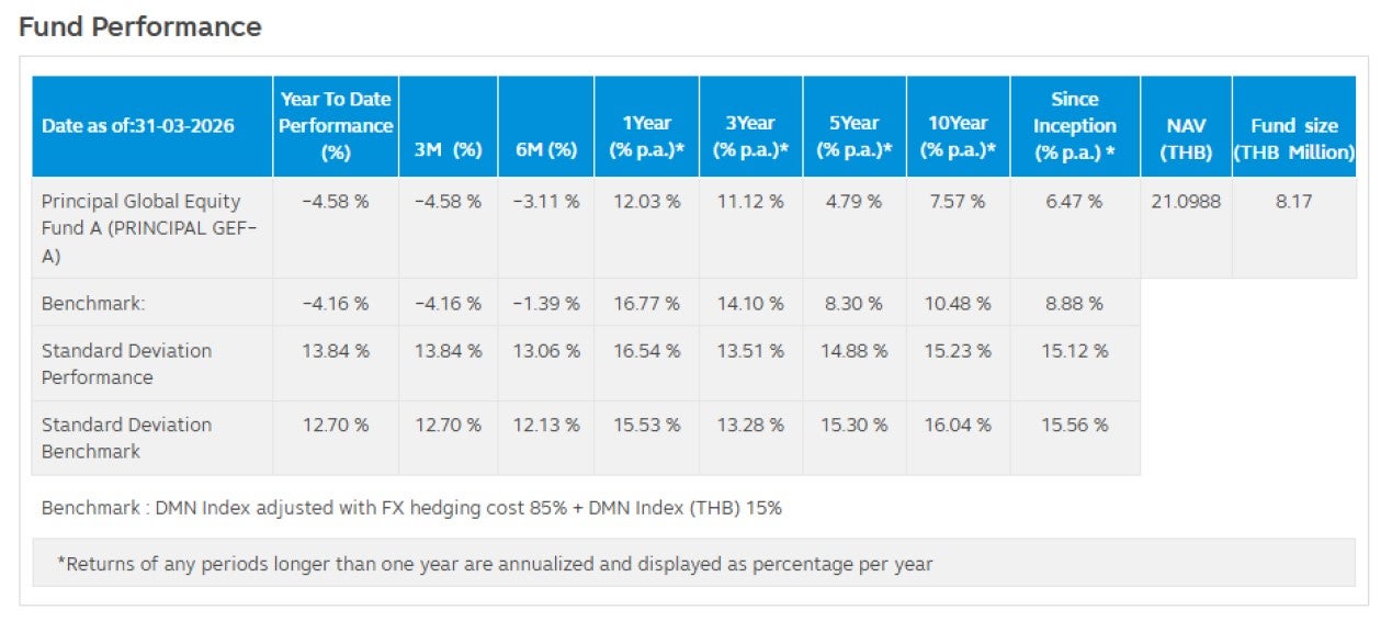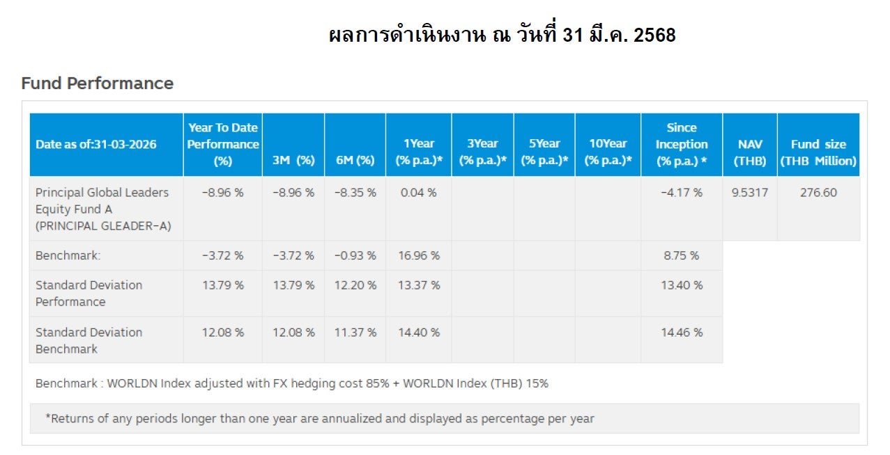คำเตือน: ผู้ลงทุนควรทำความเข้าใจลักษณะสินค้า (กองทุน) เงื่อนไข ผลตอบแทนและความเสี่ยงก่อนตัดสินใจ / PRINCIPAL GLEADER ประเทศยุโรป และอเมริกาเหนือ ผู้ลงทุนจึงควรพิจารณาการกระจายความเสี่ยงของพอร์ตการลงทุนโดยรวมของตนเองด้วย / PRINCIPAL GEF ลงทุนกระจุกตัวในประเทศสหรัฐอเมริกา ผู้ลงทุนจึงควรพิจารณาการกระจายความเสี่ยงของพอร์ตการลงทุนโดยรวมของตนเองด้วย / PRINCIPAL GEF มีการกระจุกตัวของการถือหน่วยการลงทุนจากบุคคลหรือกลุ่มบุคคลใดที่ถือหน่วยการลงทุนเกิน 1 ใน 3 เป็นสัดส่วนร้อยละ 33.61 (ณ วันที่ 27 ก.พ. 2569) โดยสามารถตรวจสอบข้อมูลผ่านเว็บไซด์ของบริษัทจัดการ (www.principal.th)/ บริษัทจัดการใช้สัญญาซื้อขายล่วงหน้าเพื่อเป็นเครื่องมือในการป้องกันความเสี่ยงด้านอัตราแลกเปลี่ยนของกองทุน (Hedging) ขึ้นอยู่กับดุลยพินิจของผู้จัดการกองทุน (dynamic hedging) (0%-105% ของมูลค่าความเสี่ยง) / กองทุนมีนโยบายลงทุนในต่างประเทศ กองทุนอาจมีความเสี่ยงด้านอัตราแลกเปลี่ยน ผู้ลงทุนอาจขาดทุนหรือได้รับกำไร จากอัตราแลกเปลี่ยน/หรือได้รับเงินคืนต่ำกว่าทุนเริ่มแรกได้ / ผู้ลงทุนควรศึกษาผลการดำเนินงานของหน่วยลงทุนแต่ละชนิดของกองทุนใน https://www.principal.th/th/mutual-fundth ก่อนตัดสินใจลงทุน / ผลการดำเนินงานในอดีตมิได้เป็นสิ่งยืนยันถึงผลการดำเนินงานในอนาคต