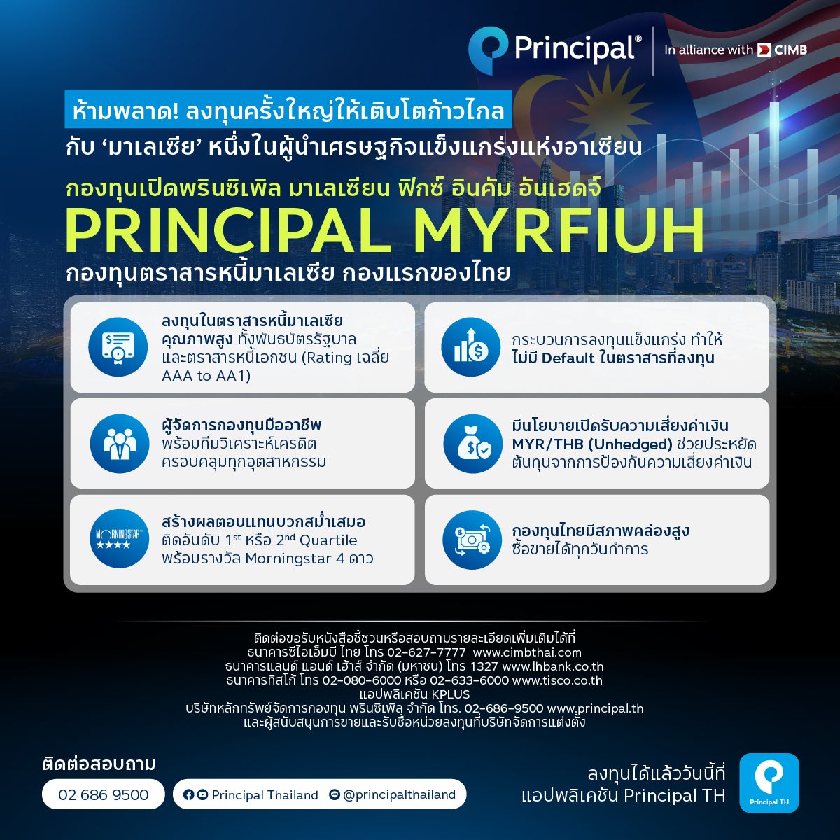 กับกองทุน กองทุนเปิดพรินซิเพิล มาเลเซียน ฟิกซ์ อินคัม อันเฮดจ์ (PRINCIPAL MYRFIUH) ที่เน้นลงทุนในตราสารหนี้มาเลเซียทั้งพันธบัตรรัฐบาลและตราสารหนี้เอกชนคุณภาพดี ที่มีอันดับความน่าเชื่อถือ Investment grade (Rating เฉลี่ย AAA to AA1) เพื่อสร้างโอกาสการลงทุนที่มั่นคงและผลตอบแทนที่ดีในอนาคต 💹
