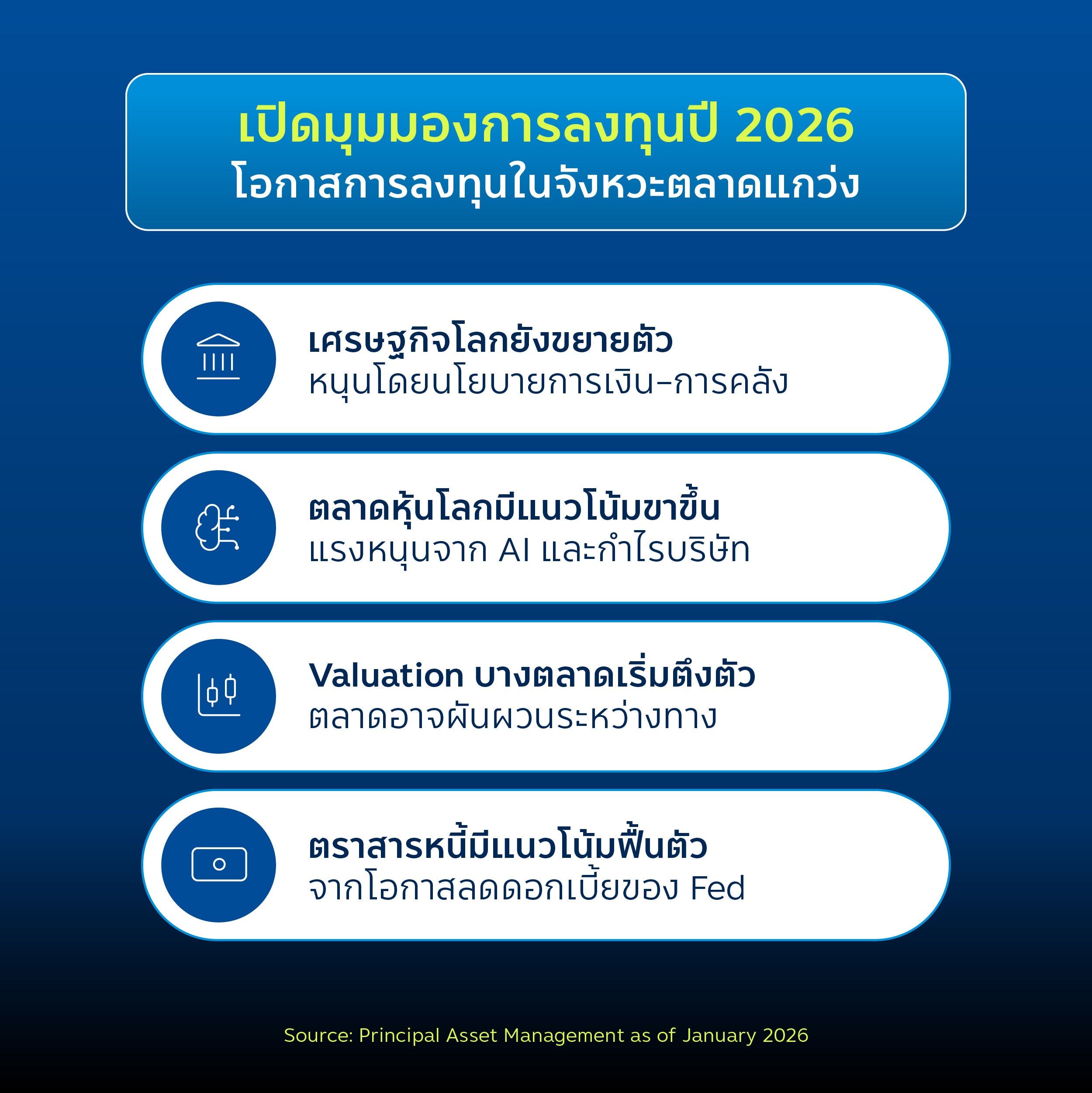📌จากภาพรวมตลาดการลงทุนในปี 2026 บลจ.พรินซิเพิล มองว่ายังคงมีโอกาสเติบโต แม้ตลาดจะมีความผันผวนเพิ่มขึ้น โดยเฉพาะในช่วงนี้ที่่มีความไม่แน่นอนด้านภูมิรัฐศาสตร์ ดังนั้น การกระจายการลงทุนและปรับพอร์ตอย่างยืดหยุ่น คือสิ่งสำคัญในการลงทุนระยะยาว