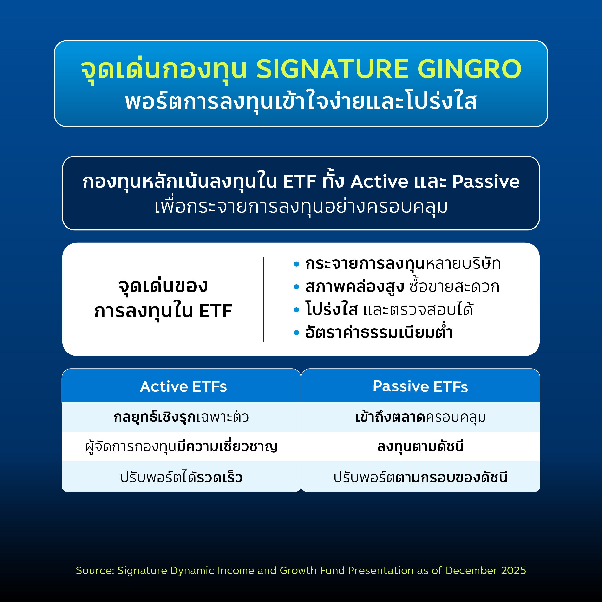 📊 กองทุนหลักของ SIGNATURE GINGRO เน้นการลงทุนผ่าน ETF ทั้งแบบ Active และ Passive เพื่อกระจายการลงทุนอย่างครอบคลุม พร้อมใช้กลยุทธ์การลงทุนที่หลากหลายและทันสมัย มุ่งสร้างผลตอบแทนในระยะยาว โดยการลงทุนผ่าน ETF มีข้อดีสำคัญ ได้แก่