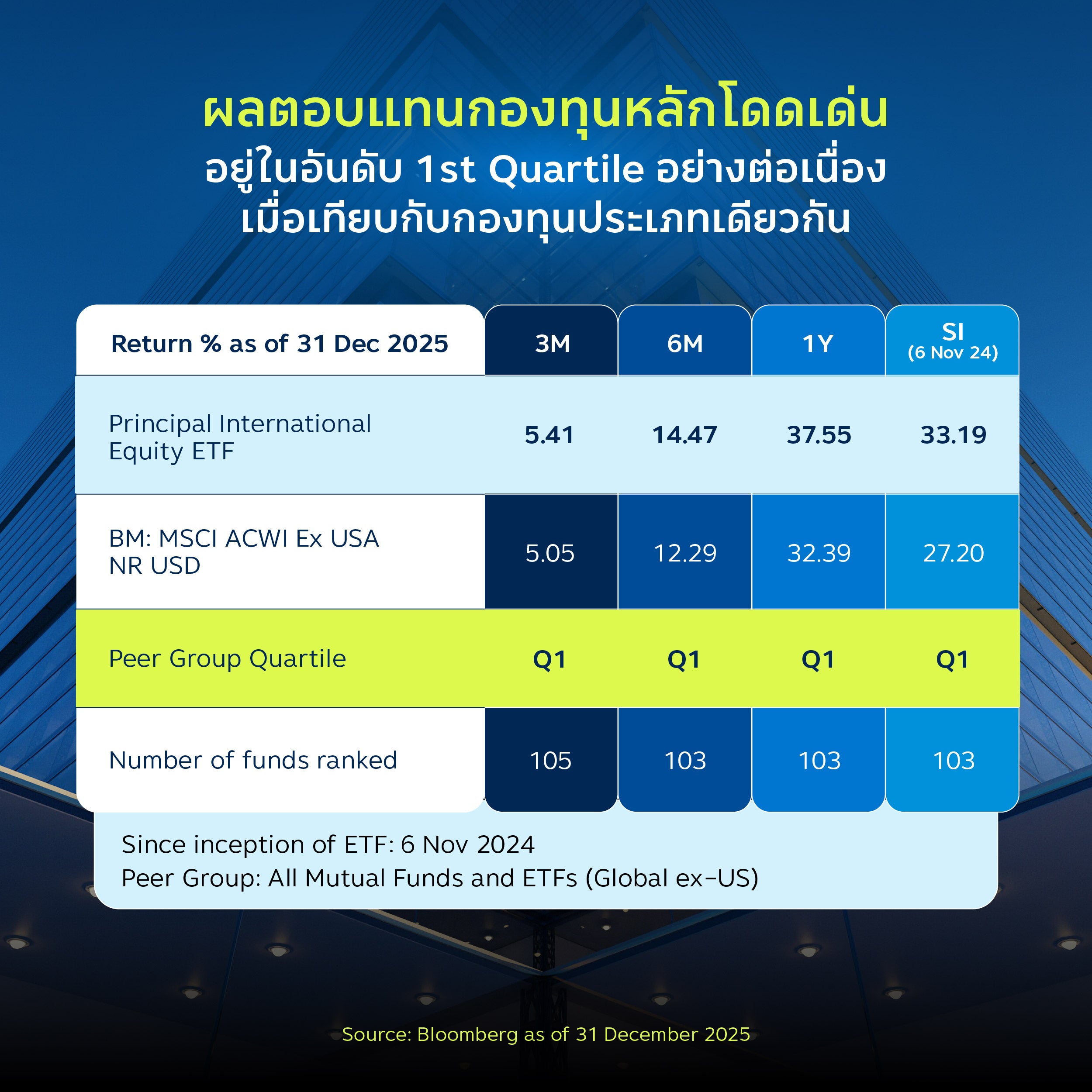 อีกทั้งยังแสดงให้เห็นถึงความแข็งแกร่งตั้งแต่ช่วงเริ่มจัดตั้งกองทุน โดยให้ผลตอบแทน 6 เดือนประมาณ +14% และ ผลตอบแทนย้อนหลัง 1 ปีประมาณ +37% สะท้อนถึงประสิทธิภาพในการคัดเลือกหุ้นและการจับโอกาสการเติบโตของตลาดหุ้นนอกสหรัฐฯ ได้อย่างเหมาะสม