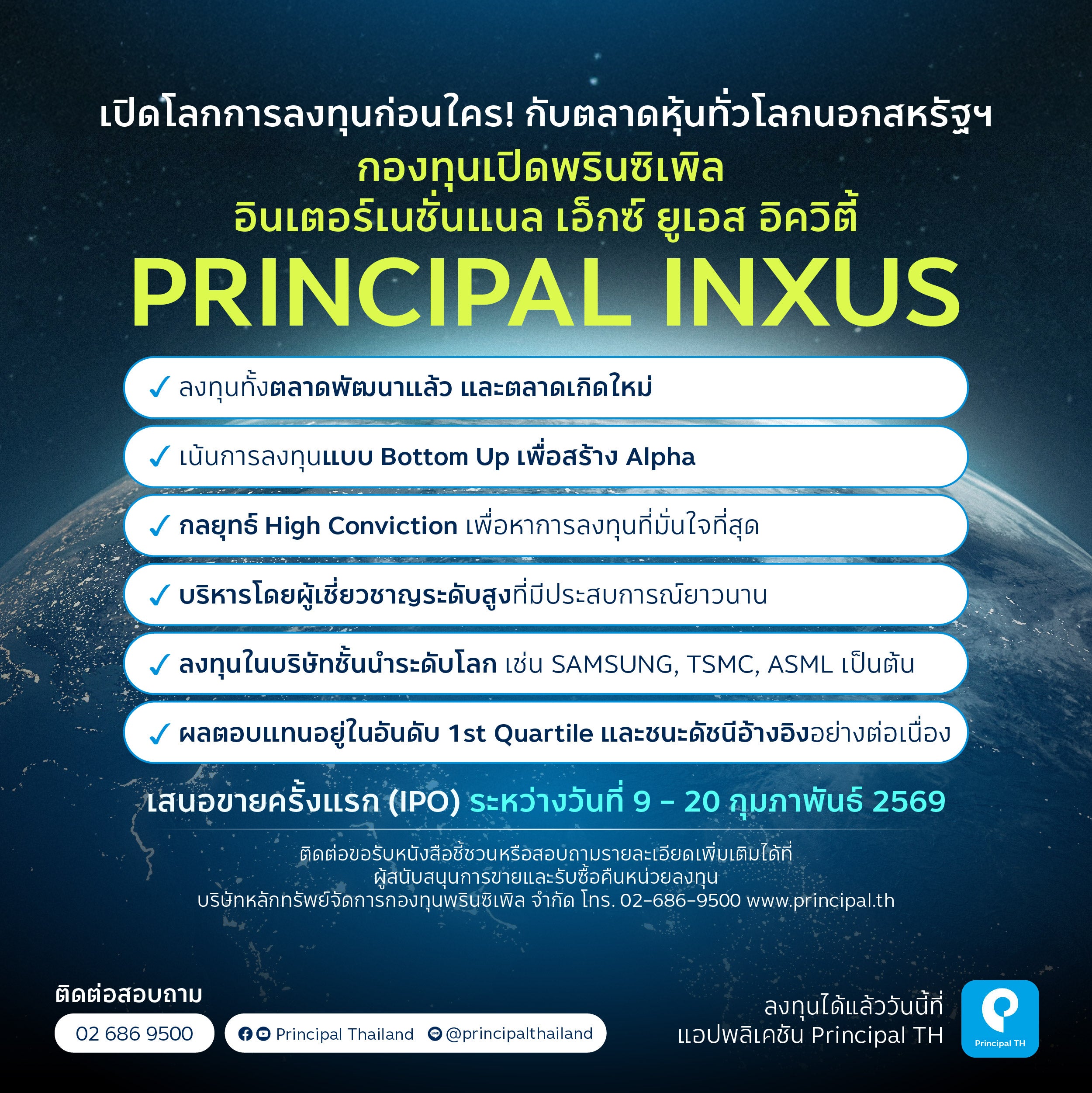 🚀 นี่คือโอกาสในการเปิดโลกการลงทุนสู่การเติบโตอย่างแข็งแกร่งกับตลาดหุ้นทั่วโลกนอกสหรัฐฯ ผ่าน กองทุนเปิด พรินซิเพิล อินเตอร์เนชั่นแนล เอ็กซ์ ยูเอส อิควิตี้ (PRINCIPAL INXUS) เป็นกองทุนแรกในประเทศไทยที่เน้นลงทุนในหุ้นทั่วโลกนอกสหรัฐฯ ครอบคลุมทั้งตลาดพัฒนาแล้วและตลาดเกิดใหม่ เพื่อสร้างโอกาสการเติบโตระยะยาวอย่างมีศักยภาพ