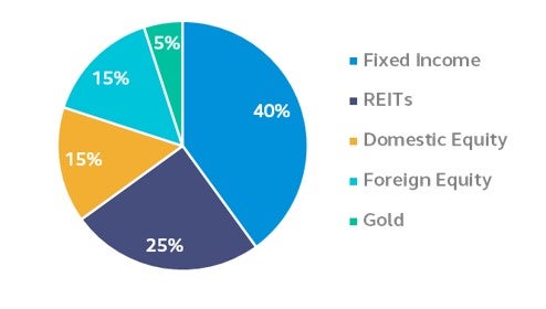 โมเดลพอร์ตของ PRINCIPAL iBALANCED ที่ผสมสินทรัพย์ 5 กลุ่ม ได้แก่ ตราสารหนี้ไทย, หุ้นไทย, หุ้นโลก, REITs และ ทองคำ