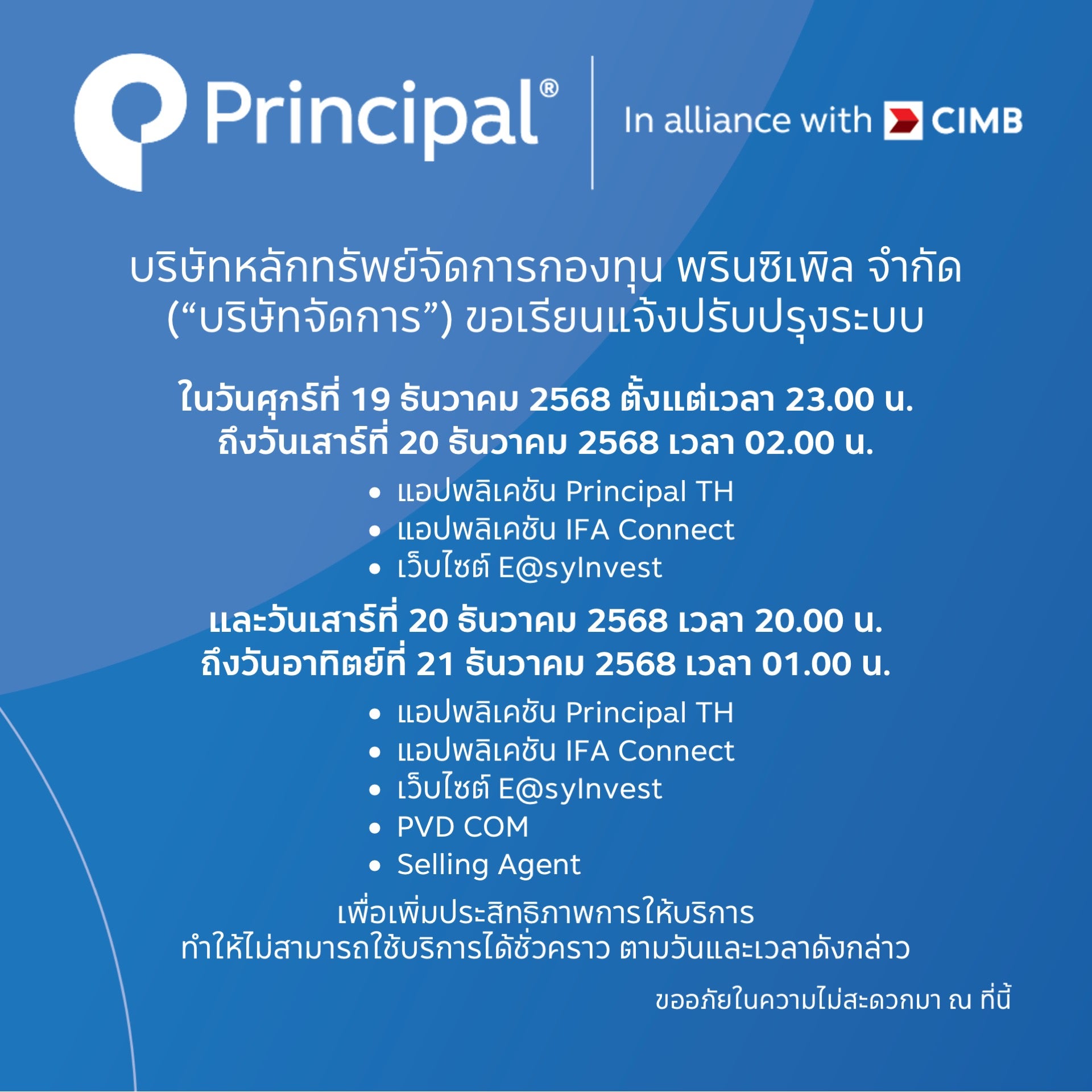 บริษัทหลักทรัพย์จัดการกองทุน พรินซิเพิล จำกัด ("บริษัทจัดการ") ขอเรียนแจ้งปรับปรุงระบบ