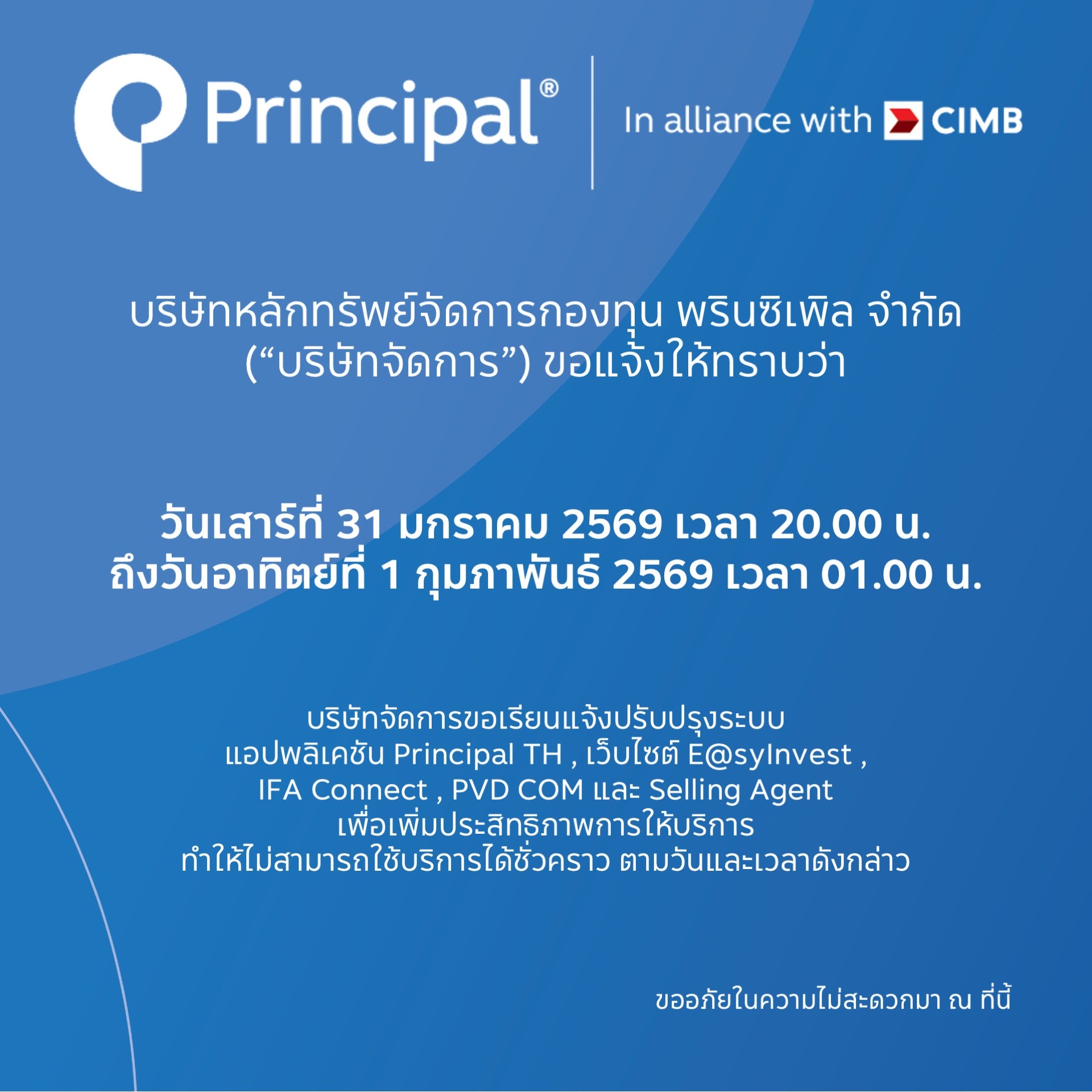 บริษัทหลักทรัพย์จัดการกองทุน พรินซิเพิล จำกัด ("บริษัทจัดการ") ขอเรียนแจ้งปรับปรุงระบบ