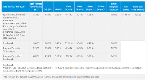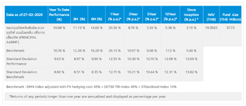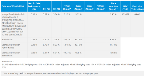 ผู้ลงทุนควรทำความเข้าใจลักษณะสินค้า เงื่อนไข ผลตอบแทน และความเสี่ยงก่อนตัดสินใจลงทุน / กองทุน PRINCIPAL MAGLOBAL ลงทุนกระจุกตัวในประเทศสหรัฐอเมริกา ผู้ลงทุนจึงควรพิจารณาการกระจายความเสี่ยงของพอร์ตการลงทุนโดยรวมของตนเองด้วย / บริษัทจัดการใช้สัญญาซื้อขายล่วงหน้าเพื่อเป็นเครื่องมือในการป้องกันความเสี่ยงด้านอัตราแลกเปลี่ยนของกองทุน (Hedging) ขึ้นอยู่กับดุลยพินิจของผู้จัดการกองทุน (dynamic hedging) (0%-105% ของมูลค่าความเสี่ยง) / กองทุนมีนโยบายลงทุนในต่างประเทศ กองทุนอาจมีความเสี่ยงด้านอัตราแลกเปลี่ยน ผู้ลงทุนอาจขาดทุนหรือได้รับกำไร จากอัตราแลกเปลี่ยน/หรือได้รับเงินคืนต่ำกว่าทุนเริ่มแรกได้ / ผู้ถือหน่วยลงทุนควรศึกษาข้อมูลเกี่ยวกับสิทธิประโยชน์ทางภาษีที่ระบุไว้ในคู่มือการลงทุนในกองทุน PRINCIPAL AARMF ด้วย หากไม่ปฏิบัติตามเงื่อนไขการลงทุน ผู้ถือหน่วยลงทุนจะไม่ได้รับสิทธิประโยชน์ทางภาษี และจะต้องคืนสิทธิประโยชน์ทางภาษี / Morning Star Copyright @ 2026 บริษัท มอร์นิ่งสตาร์ รีเสริช์ ประเทศไทย สงวนลิขสิทธิ ข้อมูลที่ประกอบในเอกสารนี้ : (1) เป็นกรรมสิทธิ์ของบริษัทมอร์นิ่งสตาร์ และ/หรือ ผู้ให้บริการข้อมูล (2) บริษัทขอสงวนสิทธิ์ในการทำซ้ำ หรือเผยแพร่ (3) บริษัทขอสงวนสิทธิ์ที่จะไม่รับผิดชอบต่อความถูกต้อง ครบถ้วน และความเสียหายต่างๆ ที่เกิดขึ้นทุกกรณีจากการนำข้อมูลไปใช้อ้างอิง / ผลการดำเนินงานในอดีตมิได้ยืนยันผลการดำเนินงานในอนาคต